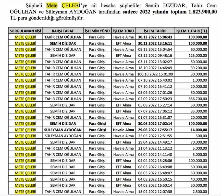 İddiaya göre, reklam ihalelerinin şartnamesini sızdıran ve daha sonra CHP Adana İl 2. Başkanlığı görevine getirilen Mete Çelebi ile firmalar arasındaki para trafiği, Adana Emniyet Müdürlüğü KOM Şube tarafından hazırlanan 878 sayfalık fezlekede yerini aldı. Fezlekede, Mete Çelebi’nin Adana Büyükşehir Belediyesi’ne yüklü miktarlarda fatura kesen Cem Tahir Oğulhan’ın sahibi olduğu Eylül Ajans’ta sigortalı çalışıyormuş gibi gösterildiği de polis tarafından belgelendi.