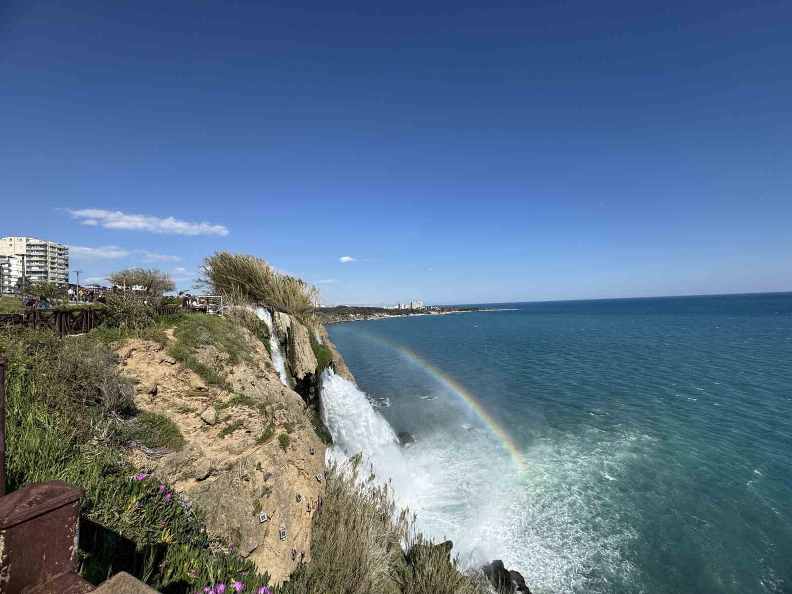 Antalya’nın Muratpaşa ilçesinde Düden Şelalesi’nde oluşan gökkuşağı, ziyaretçilere unutulmaz anlar yaşattı. Lara bölgesinde bulunan Düden Şelalesi, her yıl olduğu gibi bu sene de yerli ve yabancı turistlerin yoğun ilgisini görüyor. Doğal güzellikleri ve eşsiz manzarasıyla ziyaretçilerini kendine çeken şelalede gökkuşağı oluştu. Düden Şelalesi’nin denizle buluştuğu noktaya gelen turistler, bu doğa harikasını ölümsüzleştirmek için birbirleriyle yarıştı. Gökkuşağı, ziyaretçilere unutulmaz anlar yaşattı.