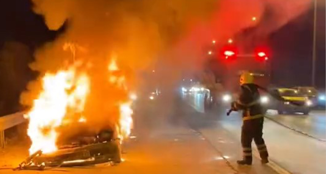 TEM otoyolu Körfez geçişinde bir otomobil alev alev yandı.