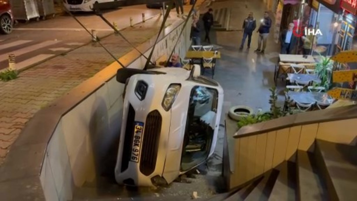 Beylikdüzü’nde el freni çekilmeyen araç kafenin bahçesine devrildi