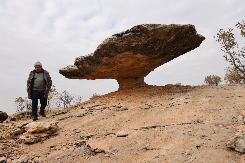 Diyarbakır’ın Kocaköy ilçesinde ince bir sütunla ayakta duran geniş kaya parçası, buzul çağı kalıntısı olarak değerlendiriliyor.