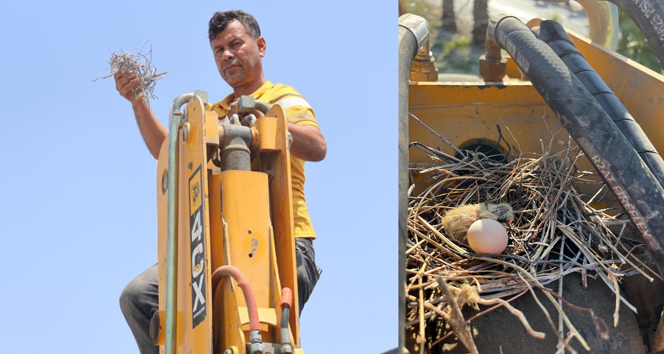 Yuva bozulmasın diye kepçesine kontak vurmayan operatörün yüzü 27 gün sonra kumru yavrularının uçup gitmesiyle güldü