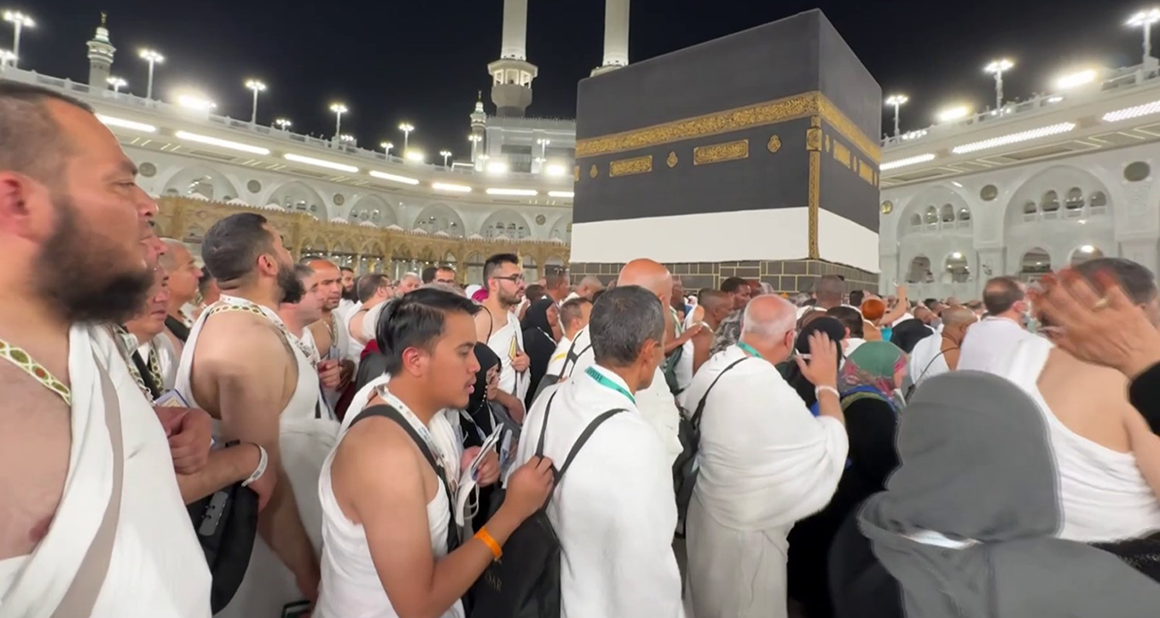Hicri 1446 yılı hac menasiklerini yerine getirmek için Mekke-i Mükerreme'ye gelip Kabe'ye koşan hacı adayları, Filistin için dua ediyorlar.