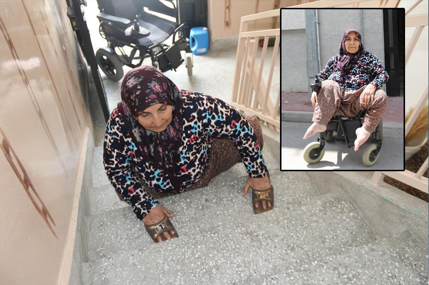 Eskişehir'de yaşayan 66 yaşındaki Hatice Avcı, engeli nedeniyle 2'nci kattaki dairesine 20 dakikada ellerine giydiği terliklerle emekleyerek çıkıyor. Oldukça zorlanan Avcı, engelli asansörü yapılmasını talep ediyor.