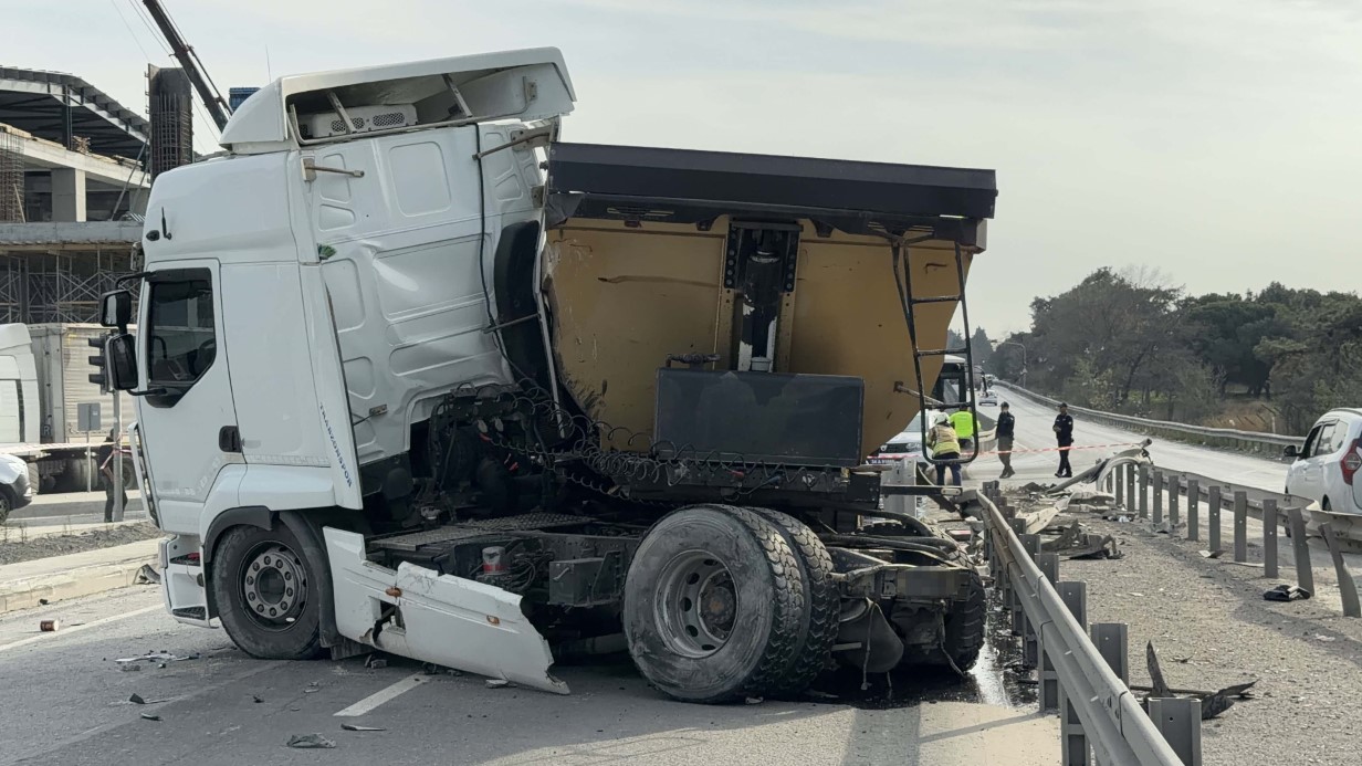 2025-12-17 13:13:40 Bariyerlere saplanıp demir yığınına dönen kamyon kabininde can pazarı İstanbul İzmir Otoyolu Bursa çevre yolunda dinlenme tesislerinin bariyerine çarpan kamyonun kabininde sıkışan sürücü Büyükşehir Belediye itfaiyesi ekiplerinin nefes kesen poerasyonuyla kurtarıldı. Kurtarma ekipleri demir yığınlarında sıkışan sürücüyü "dayan" diyerek teselli etti. Yaklaşık yarım saatlik çalışmayla kurtarılan sürücünün kaburgasında kırıklar olduğu bildirildi.