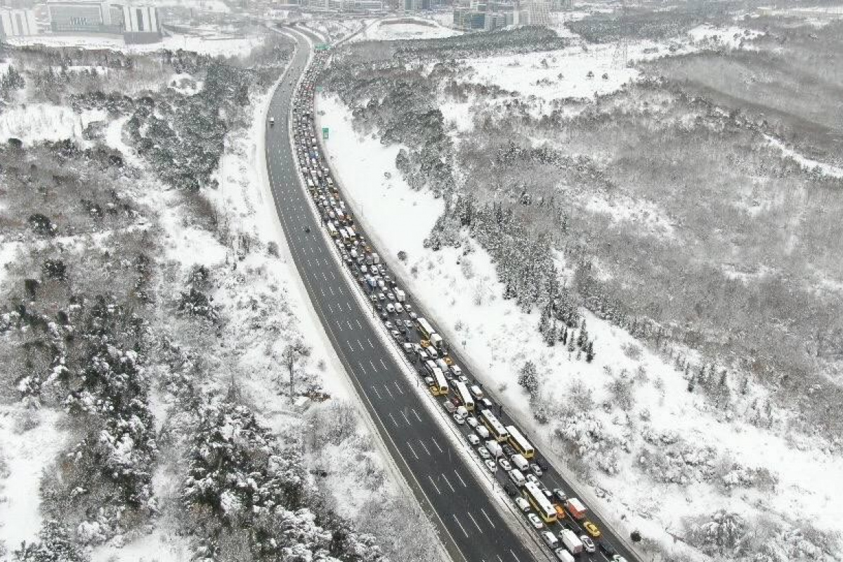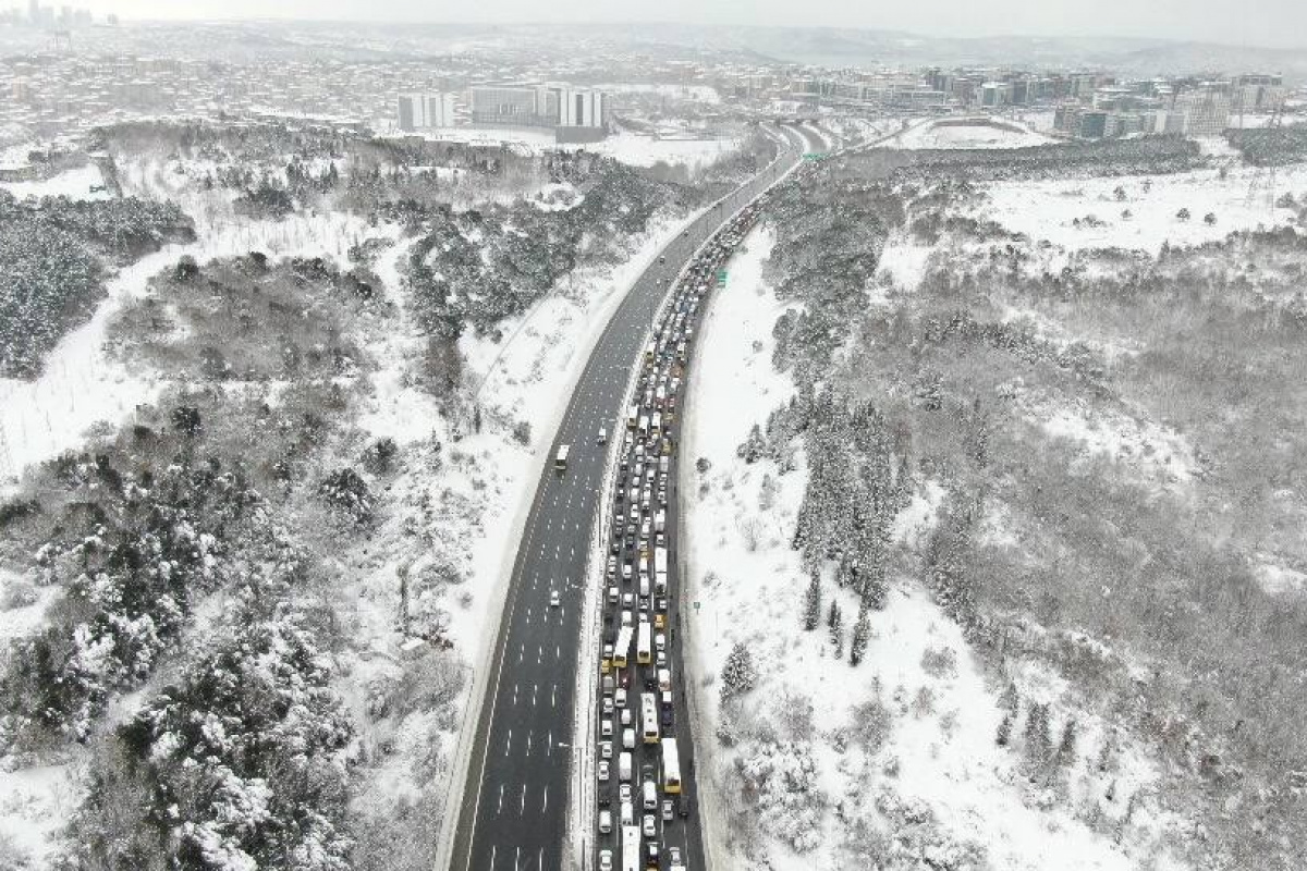 İstanbul Valiliğinin toplu taşıma ve görevli araçlar dışındaki özel araçların trafiğe çıkışının durdurulması kararının ardından, izni bulunmayan araçların köprülerden geçişlerine müsaade edilmeyince FSM Köprüsü istikametinde kilometrelerce uzun araç kuyruğu oluştu. Oluşan uzun araç kuyruğu havadan görüntülendi.