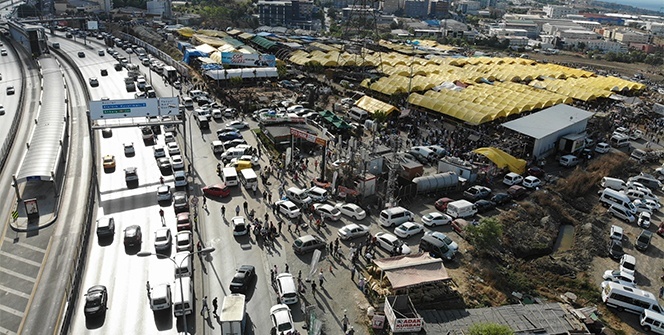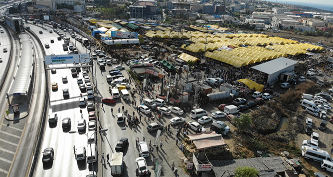 Avcılar'da E-5 yanyol üzerine açılan hayvan pazarı ve kurban kesim alanında vatandaşların E-5 karayolu üzeri ve yan yola park ettiği araçlar yüzünden trafik durma noktasına geldi. Trafiğin durduğu o anlar havadan görüntülendi.