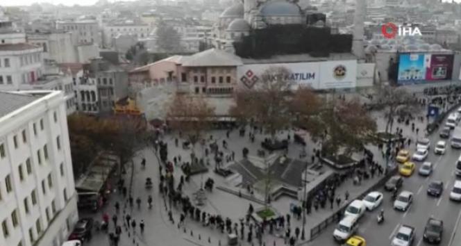 Milli Piyango Yılbaşı Özel Çekilişi’nde büyük ödüle sahip olma umuduyla, bilet satın almak için Fatih’teki Nimet Abla Gişesine gelenler yüzlerce metre kuyruk oluşturdu. Korona virüse davetiye çıkartan gişe kuyruğu havadan görüntülendi.