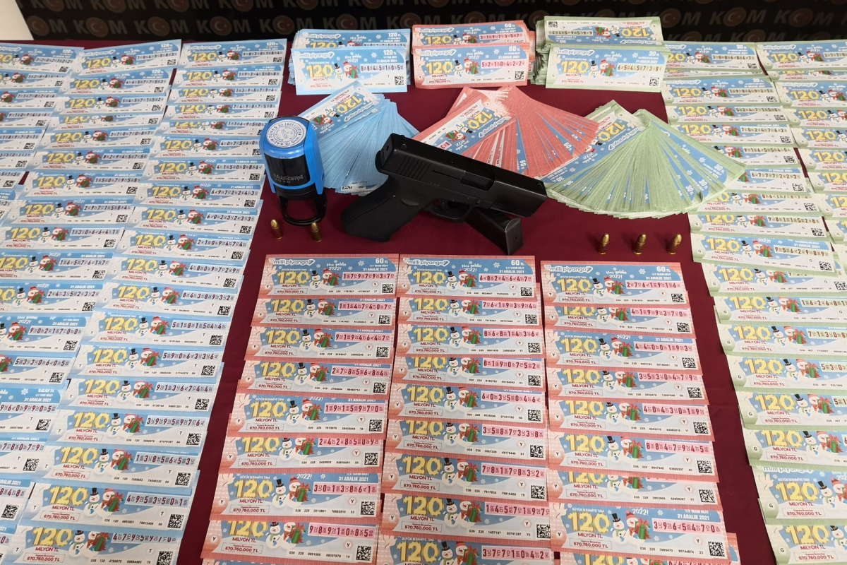 İzmir'de bir şahsın 2022 yılına ait sahte Milli Piyango biletlerini piyasaya süreceği esnada yakalanmasının ardından yapılan operasyonda, bin 816 adet yılbaşı Milli Piyango bileti, bir tabanca ve yelek, şapka ele geçirildi, olayla ilgili 4 şüpheli gözaltına alındı
