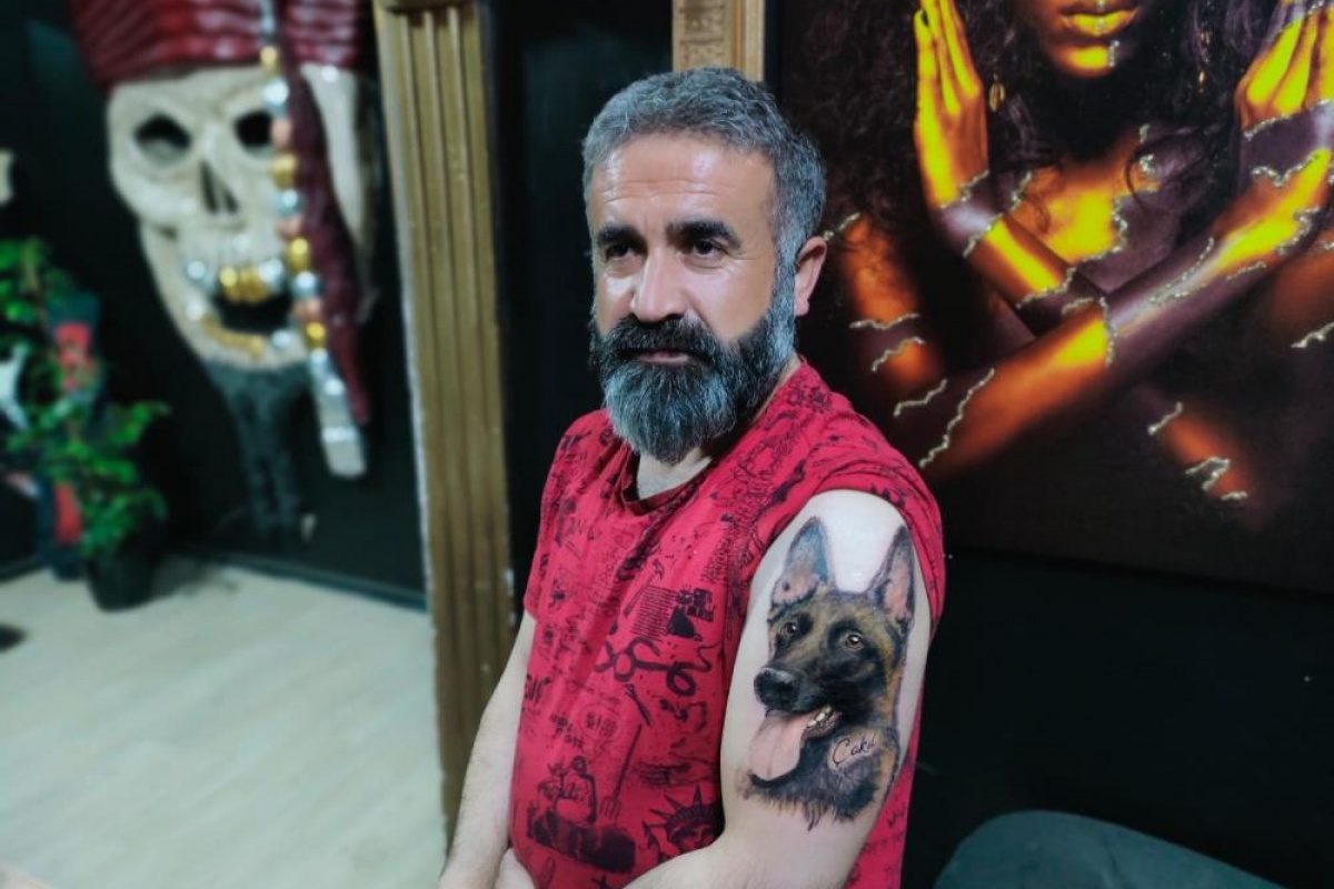 Kahramanmaraş’ta depremde enkaz altında kalan Mehmet Çabuk, yerini tespit edip kurtarılmasını sağlayan arama kurtarma köpeği Çakıl’ın portresini ve ismini dövme ile sol koluna yaptırdı.