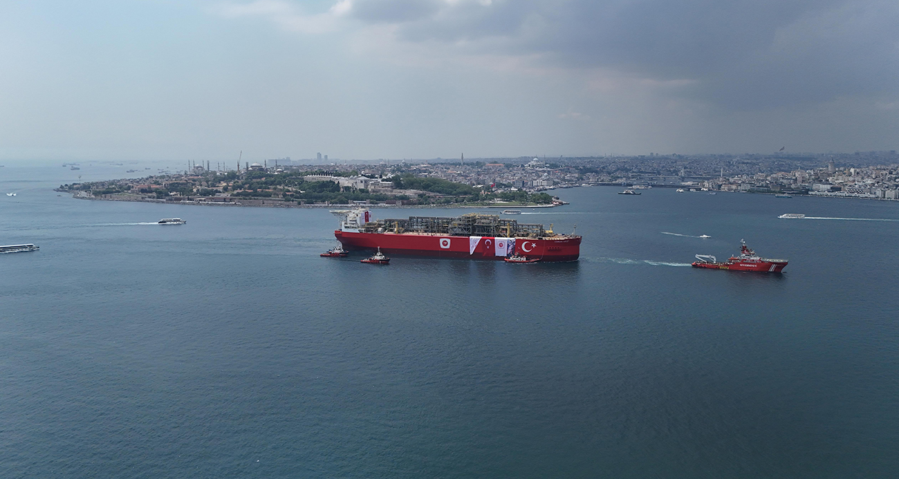 Türkiye’nin enerji alanındaki dev projelerinden biri olan yüzer doğalgaz üretim platformu "Osman Gazi", İstanbul’un fethinin 572. yıl dönümünde İstanbul Boğazı’ndan geçerek Karadeniz’e doğru yol aldı. Dev platformun geçişi, dron ile havadan görüntülendi.