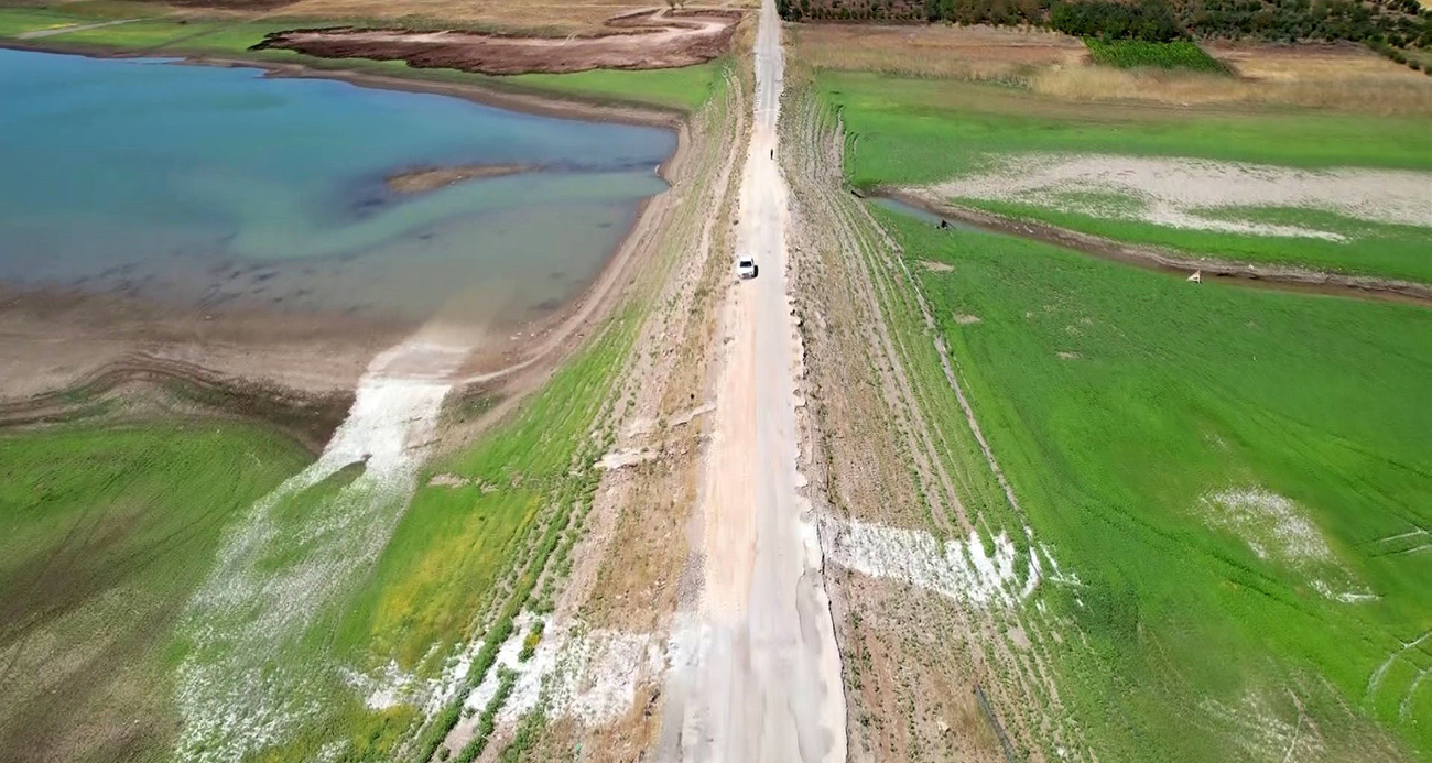 Adıyaman'da Çamgazi Baraj Göleti altında kalan eski Adıyaman-Gölbaşı karayolu, sıcak gecen yaz mevsiminde su kaynakları kuruyunca yeniden ortaya çıktı.