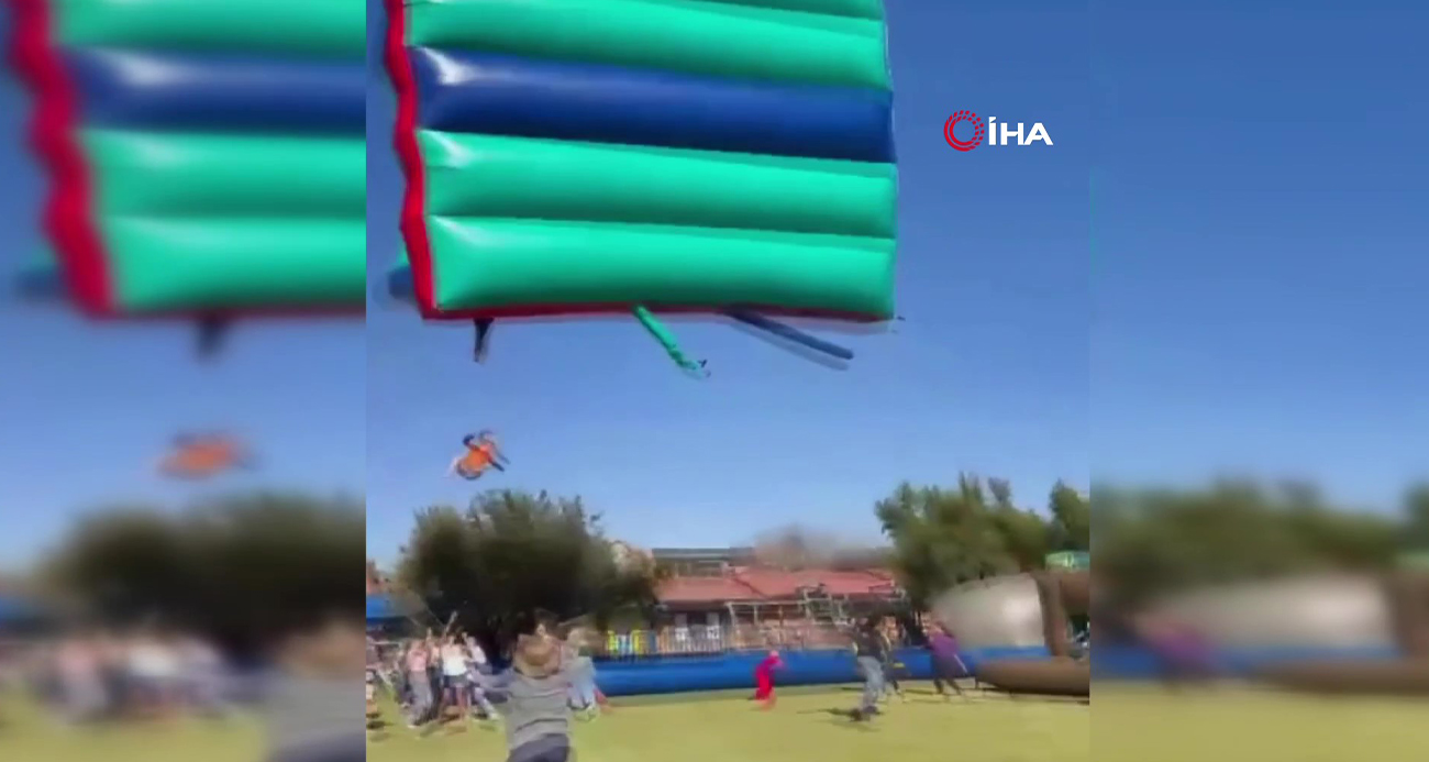 Güney Afrika'nın Krugersdorp kentinde bir okulda düzenlenen yardım etkinliği sırasında çocukların bulunduğu şişme oyun alanı ani bir rüzgarla havaya savrulurken, 2 çocuk düşerek yaralandı.