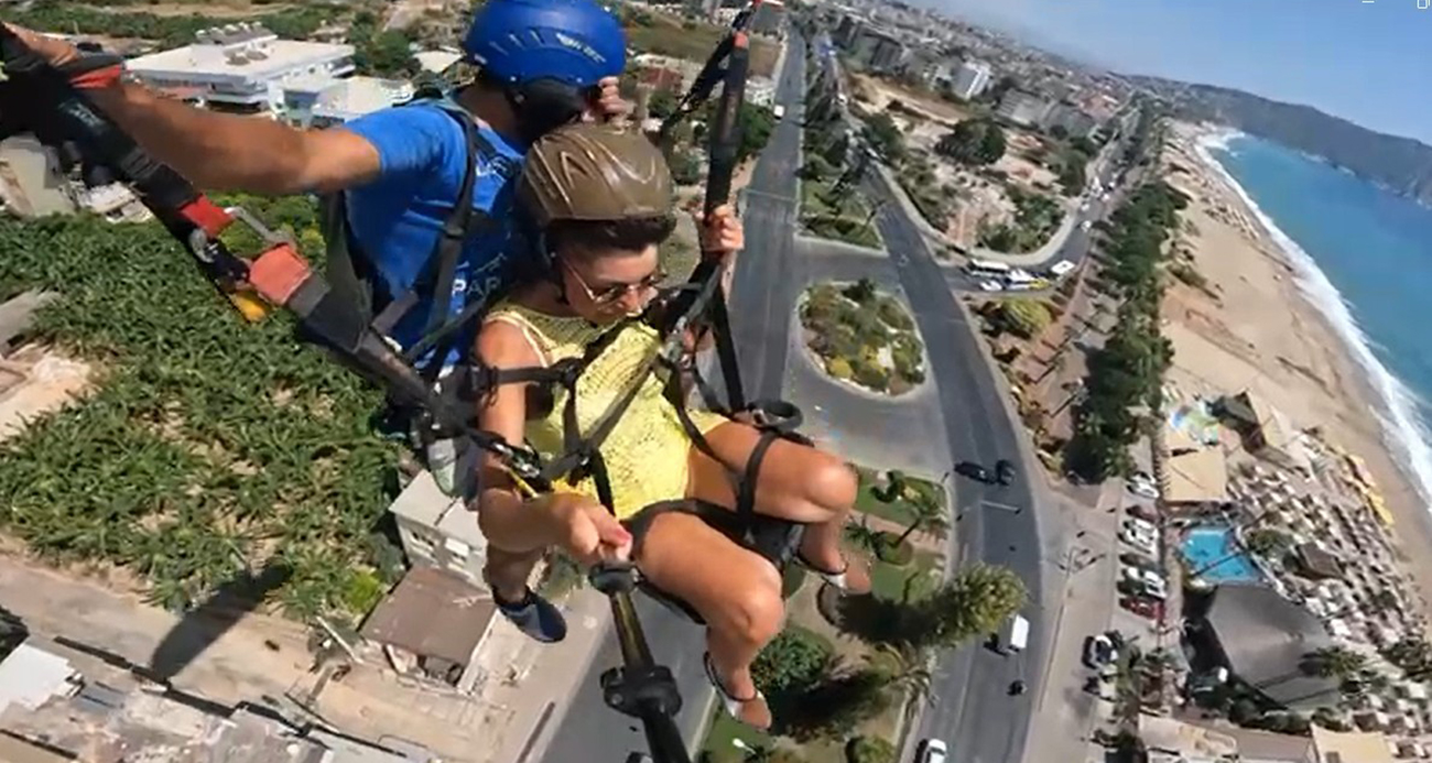 Antalya'nın Alanya ilçesinde yamaç paraşütü pilotu dün öğle saatlerinde müşterisiyle birlikte gerçekleştirdiği uçuş sırasında havadan trafik kazasını görüntüledi. Kaza görüntüleri pilotun paraşüt pilotunun kamerasına yansıdı.