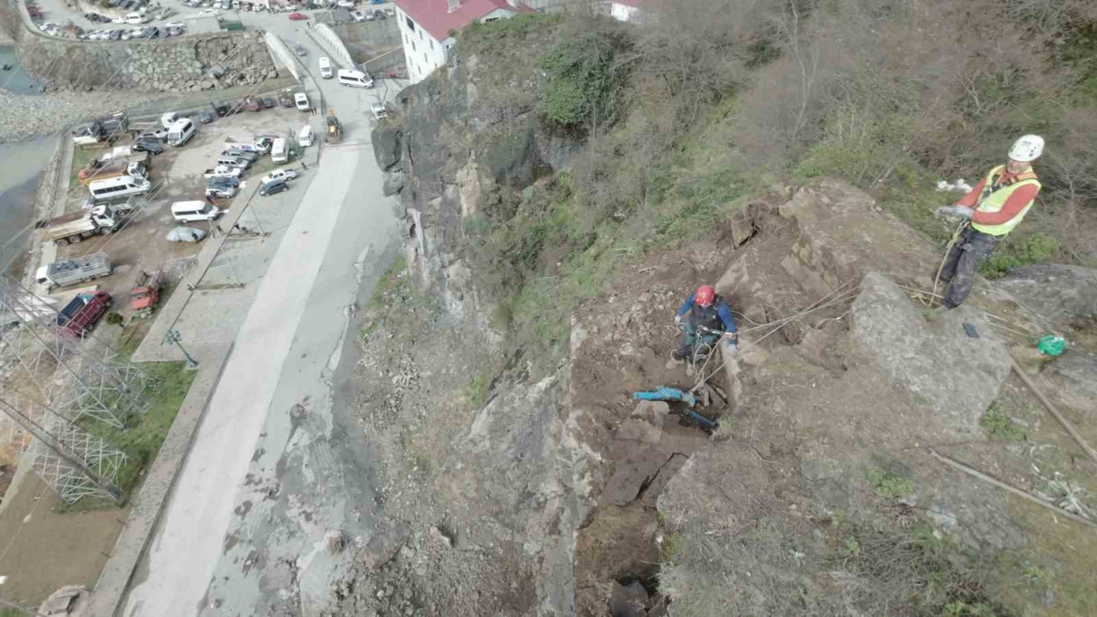 Endüstriyel dağcılar, yamaçlarda ve ulaşılması güç alanlarda çalışan, özel eğitim ve yüksek beceri gerektiren zorlu bir mesleği icra ediyor. Artvin’in Borçka ilçesine bağlı Aksu Mahallesi’nde yıllardır yol güvenliğini tehdit eden dev kaya kütleleri, profesyonel ekipler tarafından kontrollü bir çalışma ile düşürüldü. AFAD koordinesinde yürütülen çalışmalarda endüstriyel dağcılar metrelerce yüksekliğindeki yamaçlara ip sistemleriyle tırmanarak tehlike oluşturan kayalara ulaştı. Zorlu arazi şartlarında çalışan ekipler, kriko ve levye gibi özel ekipmanlar kullanarak tonlarca ağırlıktaki kaya parçalarını kontrollü şekilde bulunduğu yerden düşürdü. Çalışmalar sırasında yol ve çevrede herhangi bir risk oluşmaması için geniş güvenlik önlemleri alınırken, dev kayaların temizlenmesiyle bölgede ulaşım güvenliği sağlandı. Endüstriyel dağcı Soner Özçelik, yaptıkları işin ciddi tecrübe ve dikkat gerektirdiğini belirterek "Erişimi zor bölgelere ip kullanarak ulaşıyoruz. Orada gerekli iş çözümlerini gerçekleştiriyoruz. Burada da riskli bir alan vardı. Düşme tehlikesi bulunan taş ve kaya kütlelerini güvenli ve kontrollü bir şekilde düşürerek tehlikeyi ortadan kaldırıyoruz" dedi. Yamaçlarda metrelerce yükseklikte çalışan endüstriyel dağcılar, zorlu şartlara rağmen yaptıkları müdahalelerle hem yol güvenliğini sağlıyor hem de olası kazaların önüne geçiyor.
