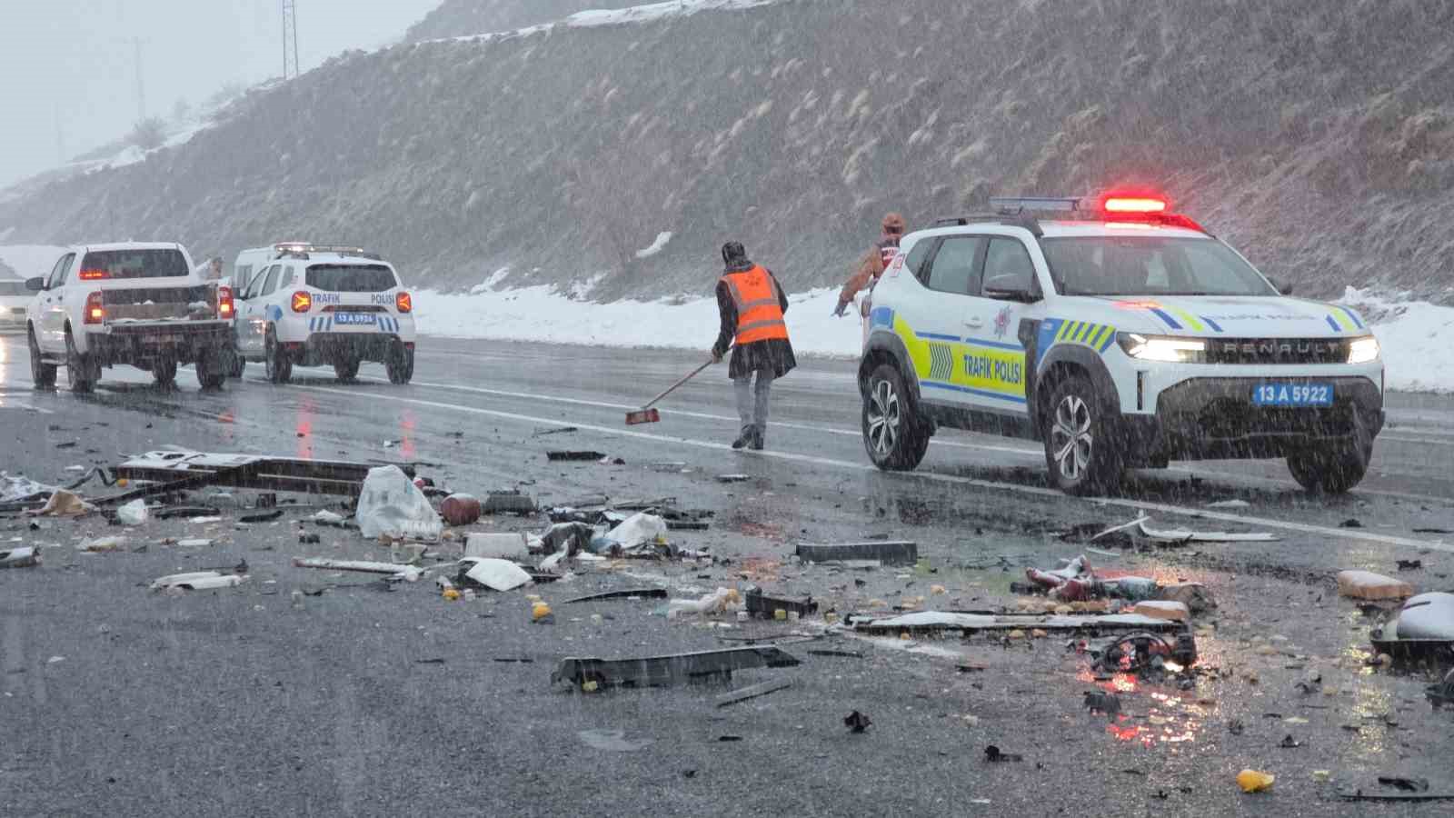 Bitlis-Van karayolunda tır ile otomobilin çarpıştığı kazada hayatını kaybeden çiftin kimlikleri belli oldu. Edinilen bilgiye göre kaza, Tatvan-Van karayolu üzerinde bulunan Alacabük köyü mevkiinde meydana geldi. Murat A. yönetimindeki 13 AAS 081 plakalı tır ile karşı yönden gelen Nazmi Atsız yönetimindeki 34 ACK 344 plakalı otomobil çarpıştı. Kazada otomobil sürücüsü Nazmi Atsız ile yanında oturan eşi Zehra Atsız olay yerinde hayatını kaybetti. Otomobilde bulunan çocukları M.S.A. (4) ve 6 aylık F.A. ile tırda bulunan sürücü Murat A. ile K.A ve M.A isimli şahıslar yaralandı. Yaralılar olay yerine sevk edilen ambulanslarla Gevaş Devlet Hastanesi’ne kaldırılarak tedavi altına alındı. Hurda yığınına dönen otomobilde sıkışan çiftin cenazeleri, Bitlis İl Afet va Acil Durum (AFAD) Müdürlüğü ile itfaiye ekiplerinin uzun uğraşları sonucu çıkartıldı. Karı kocanın cenazeleri bölgeye sevk edilen cenaze aracı ile Tatvan Devlet Hastanesi morguna kaldırıldı. Jandarma ve polis ekipleri, olay yerinde üst düzey önlem alarak trafiğin akışını tek şeritten verdi. Karayolları ekipleri yola saçılan araçların parçalarını temizleyip kaza yapan otomobil kaldırıldıktan sonra trafik normale döndü. Kazayla ilgili geniş çaplı tahkikat başlatıldı. 6 aylık bebeğin biberonu görevlilerin yüreğini burktu Kazada ağır yaralanan 6 aylık F.A.’nın biberonu, oyuncağı ile 4 yaşındaki M.S.A’nın scooteri ile kaza yapanların ayakkabıları yola savruldu. Yola saçılan biberon ile scooter yürekleri burktu.