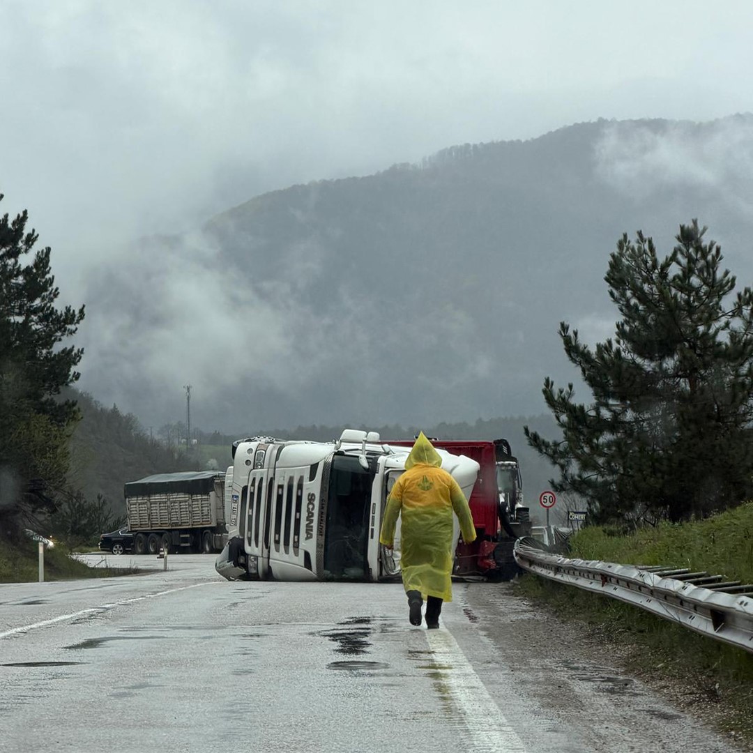 Bolu’da kömür yüklü tır, kayganlaşan yolda devrildi