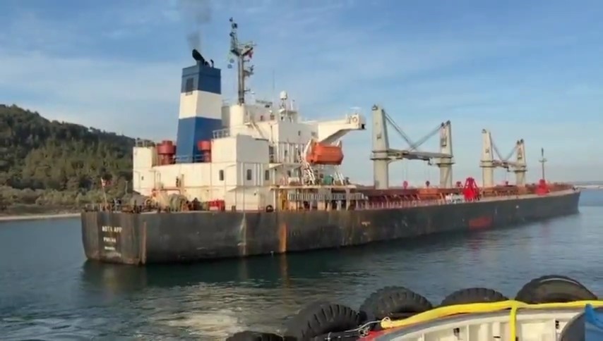 Çanakkale Boğazı’ndan geçişi sırasında makina arızası yaparak karaya oturan ’NOTA APP’ isimli dökme yük gemisi için kurtarma çalışması başladı. Çanakkale Boğazı çift yönlü olarak trafiğe kapatıldı. Rusya’dan Mısır’a giden Panama Bayraklı 189 metre boyundaki ’NOTA APP’ isimli 51 bin 258 ton tahıl yüklü dökme yük gemisi Çanakkale’nin Eceabat ilçesi Kilitbahir köyü açıklarında makina arızası yaptı. Geminin kaptanı, durumu telsizle Çanakkale Boğazı Gemi Trafik Hizmetleri Merkezi Müdürlüğüne bildirdi. Makina arızası ardından sürüklenmeye başlayan gemi bir süre sonra karaya oturdu. Kıyı Emniyeti Genel Müdürlüğüne ait ’KURTARMA-21’ romörkörü ve ’KEGM-8’ botu bölgeye sevk edildi. Balıkadamların dalışı ardından gemide kurtarma çalışması başlayacak. Boğazdan geçiş yapan diğer gemiler de arızayla ilgili bilgilendirildi. Kurtarma çalışması başladı, boğaz trafiğe kapandı Karaya oturan ’NOTA APP’ gemisi için Kıyı Emniyeti Genel Müdürlüğü ekipleri kurtarma çalışmasına başladı. Kurtarma çalışması nedeniyle Çanakkale Boğazı trafiği çift yönlü olarak askıya alındı.
