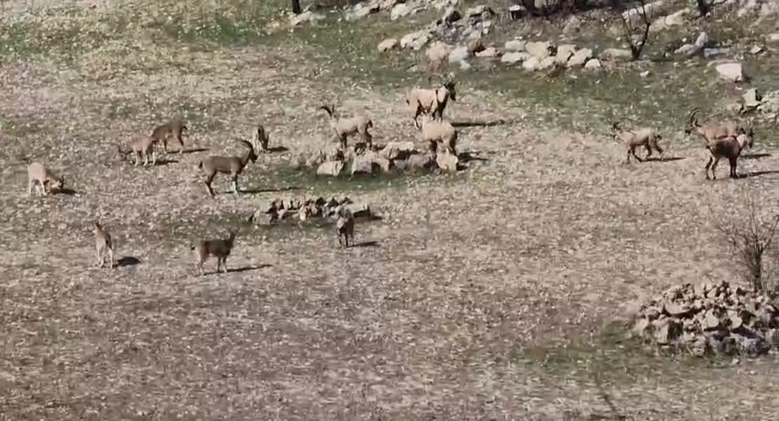 Diyarbakır’ın Çermik ilçesinde nesli tükenme tehlikesi nedeniyle koruma altında olan ve kaçak avlanması durumunda 940 bin lira ceza kesilen dağ keçileri sürü halinde görüntülendi. Çermik Saltepe Mahallesi’nde nesli tükenme tehlikesi altında olan dağ keçisi sürü halinde görüntülendi. Dağ keçilerini sürü halinde çeken Selim Toprak, ’’Tarlada çalışırken uzakta dağ keçisi sürüsü gördüm. Ben de o anları cep telefonu kamerası ile kayıt altına aldım. İlk defa bu kadar kalabalık bir sürü gördüm’’ dedi. Çermik’te doğal yaşam alanlarında sık sık dağ keçileri ve yaban hayvanları görülürken, dağ keçilerini kaçak avlayanlara 940 bin lira idari para cezası uygulandığı öğrenildi.