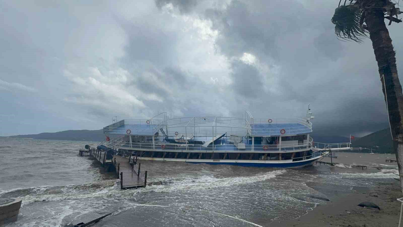 Muğla’nın Marmaris ilçesinde etkili olan sağanak yağış ve fırtına sebebiyle karaya oturan tekne sayısı 4 olurken, Uzunyalı mevkiinde iskeleye çarparak karaya oturan gezi teknesinin kurtarılması için çalışma başlatıldı. Marmaris ilçesinde dün gece başlayan sağanak yağış ve fırtına sabah saatlerinden itibaren etkisini artırırken, denizde de etkisini gösteren fırtına sebebiyle bazı tekneler de sürüklendi. Sabah saatlerinde Türk bayraklı 3 gezi teknesi Hisarönü Körfezi İnbükü Koyu’nda karaya oturmuştu. Ağır hava şartları nedeniyle sürüklenerek karaya oturan Granitsa, Kastabos ve Wiseone isimli 3 gezinti teknesinin ardından, Uzunyalı mevkiinde de 1 gezi teknesi iskeleye çarparak karaya oturdu. Olayda herhangi bir can kaybı yaşanmazken, kısa sürede bölgeye gelen Sahil Güvenlik ekipleri çalışma başlattı. Yapılan incelemelerin ardından teknenin kurtarılması için başlatılan çalışmalar devam ediyor. Marmaris’te her yıl benzer görüntülerin yaşandığını ifade eden Siteler Mahallesi Muhtarı Gülizar Pekpak; "Sahil Güvenlik geldi, hemen müdahale ettiler. Muğla AFAD aradı hemen. Bu yaşanan durum bence bir ihmal. Çünkü bu her sene olan bir şey. Marmaris’in havası belli. Turuncu alarm verildi. Niye yapıyorsunuz ki. Bu bilinçsizliktir" dedi.