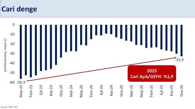 Hazine ve Maliye Bakanı Mehmet Şimşek, "Jeopolitik gerginliklerle artan enerji fiyatları nedeniyle 2026 yılında cari açık program öngörülerimizin üzerinde gerçekleşebilir" dedi. Hazine ve Maliye Bakanı Mehmet Şimşek, sosyal medya hesabından cari açık verilerine ilişkin değerlendirmelerde bulundu. Uygulanan ekonomi programıyla dış finansman ihtiyacı ve borçluluk azalırken ekonominin şoklara karşı dayanıklılığının arttığını belirten Şimşek, açıklamasında şu ifadelere yer verdi: "Yıllık cari açık ocak ayında 32,9 milyar dolar oldu. Jeopolitik gerginliklerle artan enerji fiyatları nedeniyle 2026 yılında cari açık program öngörülerimizin üzerinde gerçekleşebilir. Güçlenen makroekonomik temellerimiz sayesinde bu artışın yönetilebilir olduğunu değerlendiriyoruz. Uyguladığımız programla dış finansman ihtiyacı ve borçluluk azalırken ekonomimizin şoklara karşı dayanıklılığı arttı. Brüt dış borç stokunun GSYH’ye oranı 2025’te yüzde 32,6’ya geriledi. Kırılganlıkları azaltan, yüksek katma değerli üretimi ve kalıcı refah artışını destekleyen politikalarımızı uygulamaya devam edeceğiz."