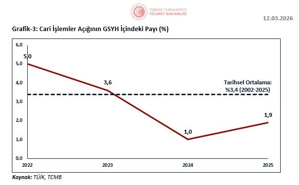 Ticaret Bakanı Ömer Bolat, "Küresel konjonktürde artan jeopolitik gerilimlere, savaşlara ve ticarette korumacılık uygulamalarındaki hızlı artışlara rağmen cari işlemler açığı son 3 yılda makul düzeylerde ve istikrarlı bir görünüm sergilemiştir" dedi. Bakan Bolat, Türkiye Cumhuriyet Merkez Bankasının (TCMB) ocak ayı ödemeler dengesi verilerine ilişkin yazılı açıklamada bulundu. Söz konusu ayda cari işlemler açığının 6,8 milyar dolar, yıllıklandırılmış cari işlemler açığının ise 32,9 milyar dolar olarak gerçekleştiğini belirten Bolat, altın ve enerji hariç yıllıklandırılmış cari işlemler hesabının 33,9 milyar dolar fazla verdiğini ifade etti. Bolat, hizmet ihracatının güçlü seyrini devam ettirdiğine ve ocak ayında, yıllıklandırılmış olarak, geçen yılın aynı ayına göre yüzde 5 artarak tüm zamanların en yüksek seviyesi olan 123,5 milyar dolara ulaştığını aktardı. Bakan Bolat, şu ifadelere yer verdi: "Seyahat gelirlerimiz ocak ayında 42,8 milyar dolar, taşımacılık gelirlerimiz ise 60,2 milyar dolar olarak gerçekleşmiştir. Ocak ayı itibarıyla mal ve hizmet ihracatı toplamı, geçen yıla göre yüzde 4 artarak 396 milyar dolara yükselmiştir. 2025’te cari işlemler açığının milli gelire oranı yüzde 1,9 olarak gerçekleşerek tarihi ortalamanın altında kalmıştır. Küresel konjonktürde artan jeopolitik gerilimlere, savaşlara ve ticarette korumacılık uygulamalarındaki hızlı artışlara rağmen cari işlemler açığı son 3 yılda makul düzeylerde ve istikrarlı bir görünüm sergilemiştir." ABD-İsrail ve İran savaşının enerji fiyatları ve dış ticaret kanalları üzerinden etkisini artırmasının cari işlemler açığında yukarı yönlü riskler oluşturduğuna işaret eden Bolat, "Bu çerçevede, Bakanlık olarak jeopolitik çalkantıların dış ticaretimizde oluşturduğu risklerin etkisinin sınırlandırılmasına yönelik çalışmalarımızı sürdürmekteyiz" dedi. Bolat, TCMB’nin ödemeler dengesi istatistiklerinde veri kalitesini artırmak amacıyla borçlanma senetlerine yönelik faiz giderlerinin hesaplanmasında mikro veri tabanlı yeni bir yönteme geçtiğine söyleyerek, "Bu yöntem değişikliği neticesinde, Eylül 2020’den itibaren birincil gelir dengesi altındaki ’portföy yatırımları/gider’ kalemi toplamda 8,9 milyar dolar yukarı yönlü güncellenmiştir. 2025’te ise ’portföy yatırımları/gider’ kaleminde 4,8 milyar dolar yukarı yönlü önemli düzeyde bir revize gerçekleşmiştir. Bu revizyonlar neticesinde 2025 yılı cari işlemler açığı 25,2 milyar dolardan 30,1 milyar dolara revize olmuştur" ifadelerini kullandı.
