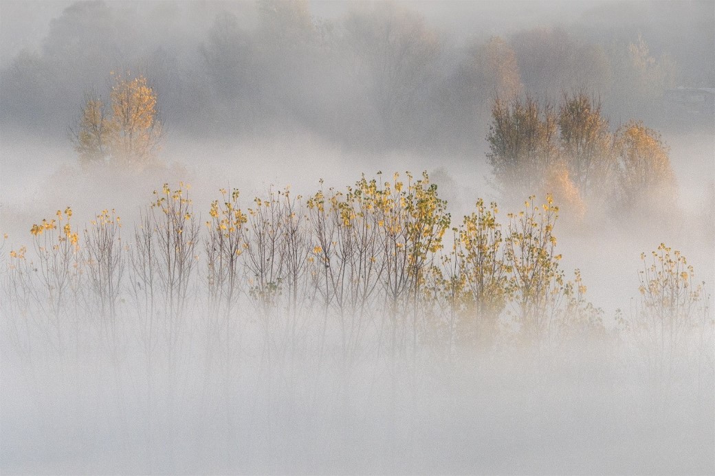 Kılıçoğlu'nun fotoğraflarında, sarı ve turuncuya dönen ağaçların arasından yükselen sis, hem doğanın ritmini hem de Mezopotamya'nın kadim peyzajını şiirsel bir dille yansıtıyor.