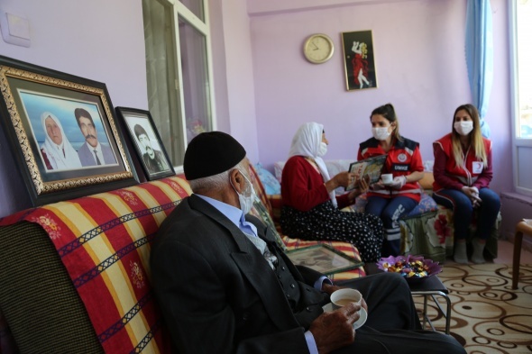 Valilik koordinesinde hizmet veren Vefa Sosyal Destek ekibindeki kadın astsubaylar, yaşlı çiftin "Arkadaşlarınızı alın kahve içmeye gelin" davetini bugün yerine getirdi. Kadın astsubaylar, AFAD, UMKE ve Kızılay`dan vefa ekibinde görevli arkadaşlarını da alarak Neşet Dede ile Emine Nine`nin evine gitti. Vali Çetin Oktay Kaldırım`ın selamını ileten, çiçek ve kahve götüren ekipler, kahve eşliğinde sohbet etti. Vali Kaldırım da çifti telefonla arayarak, bayramlarını kutladı.