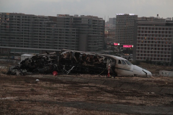 İniş takımı arızalandığı için Atatürk Havalimanına acil inişi yaptığısırasında pistten çıkarak yanan özel jetin durumu , hava aydınlanınca ortaya çıktı.