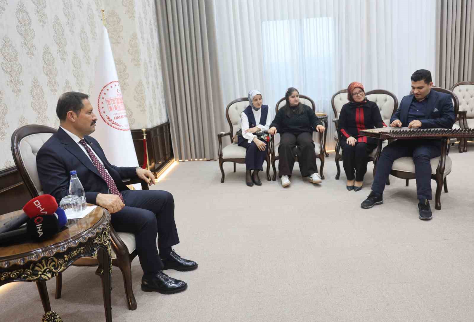 Hatay Valisi Mustafa Masatlı’nın misafiri olan otizimli Ertuğrul, kanun çalarak ve şarkı söyleyerek yeteneğiyle kulakların pasını sildi. Yeteneğiyle takdir toplayan Ertuğrul, Vali Masatlı’dan övgü aldı. Otizm Farkındalık Günü kapsamında otizmli çocuklar, Hatay Valiliği’nde misafir edildi. Ziyarette çocuklar, Vali Mustafa Masatlı’yla bir araya geldiler. Otizmli çocuklardan Ertuğrul’un kanun çalarak şarkı söylemesi yürekleri ısıtırken otizmli Hatice de Vali Masatlı için yaptığı resmi hediye etti. Yeteneğiyle kulakların pasını silen Ertuğrul, Vali Masatlı’dan takdir aldı. "Özel gereksinimli evlatlarımızın hayatın her alanında daha güçlü, daha görünür ve daha mutlu bireyler olarak yer almaları son derece bizim için kıymetlidir" Özel bireylerin hayatın her alanında güçlü ve mutlu bireyler olmaları için her desteği vereceklerini ifade eden Hatay Valisi Masatlı, "Bugün bizim için çok özel ve çok anlamlı bir gün. 2 Nisan Dünya Otizm Farkındalık Günü vesilesiyle; kıymetli evlatlarımız Ertuğrul ve Hatice Merve’yi, diğer çocuklarımızı ve ailelerini valiliğimizde ağırladık. Bundan da çok ciddi derecede memnuniyet duyduk. Ertuğrul evladımızın kanun ile icra ettiği eser ve seslendirdiği şarkı bizlere sadece güzel bir müzik dinletisinin dışında aynı zamanda yüreğimize dokunan hafızamızda yer edecek çok kıymetli bir an yaşattı. Onun sanata olan ilgisi, disiplini ve gayreti her evladımızın uygun imkan ve doğru destekle ne denli büyük başarılara ulaşabileceğinin de bize bir manada aslında kanıtıdır. Merve evladımızın büyük bir emekle hazırladığı resim de bizlere çok güzel aslında bir portre sundu. Bizleri duygulandırdı. O güzel eser de yalnızca renkleri ve çizgileri değil sevgi dolu yüreği, güçlü bir hayal dünyasını ve umut dolu bir bakışı da görmüş olduk. Bizler inanıyoruz ki otizm bir eksiklik değildir. Farklı bir gelişim biçimi, farklı bir duygu ve yetenek dünyasıdır. Mühim olan bu farklılığı doğru anlamak, sevgiyle karşılanmak ve her bir evladımızın kendi potansiyelini ortaya koyabileceği bir hayat alanı aslında oluşturmaktır. Özel gereksinimli evlatlarımızın hayatın her alanında daha güçlü daha görünür ve daha mutlu bireyler olarak yer almaları son derece bizim için kıymetlidir. Bugün burada bir kez daha gördük ki sevgiyle desteklenen imkanla buluşturulan ve yürekten anlaşılan her evladımız sahip olduğu, kabiliyetleriyle hepimize ilham verecek" ifadelerini kullandı.