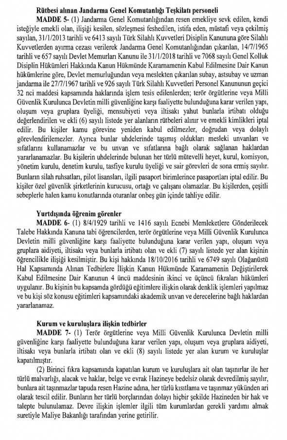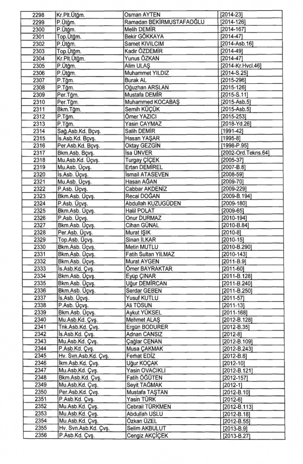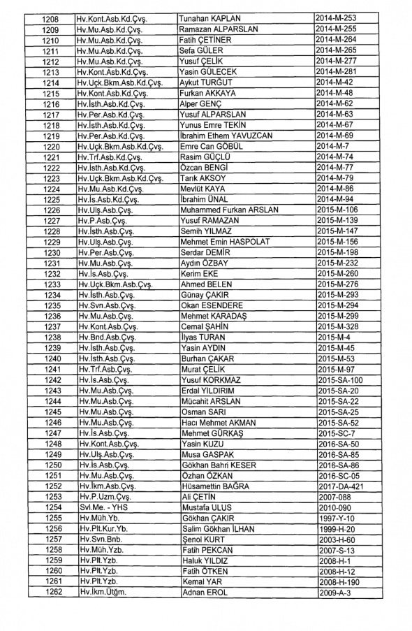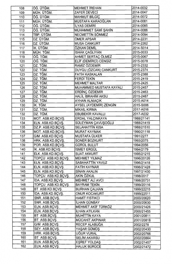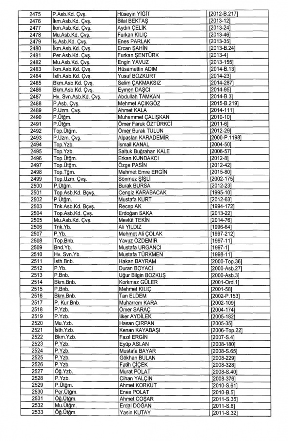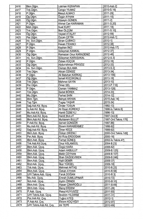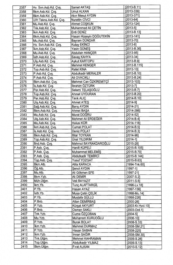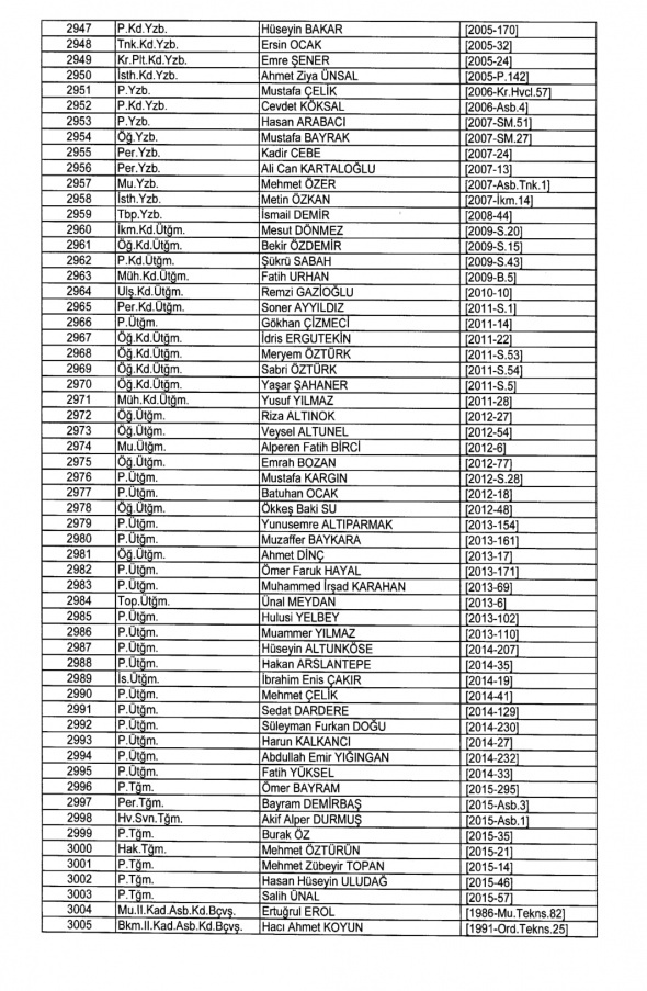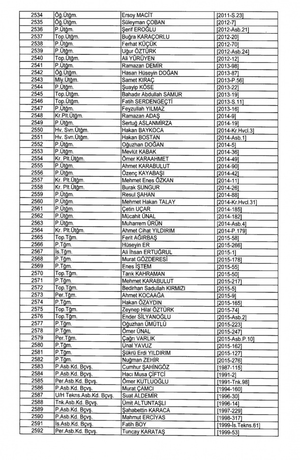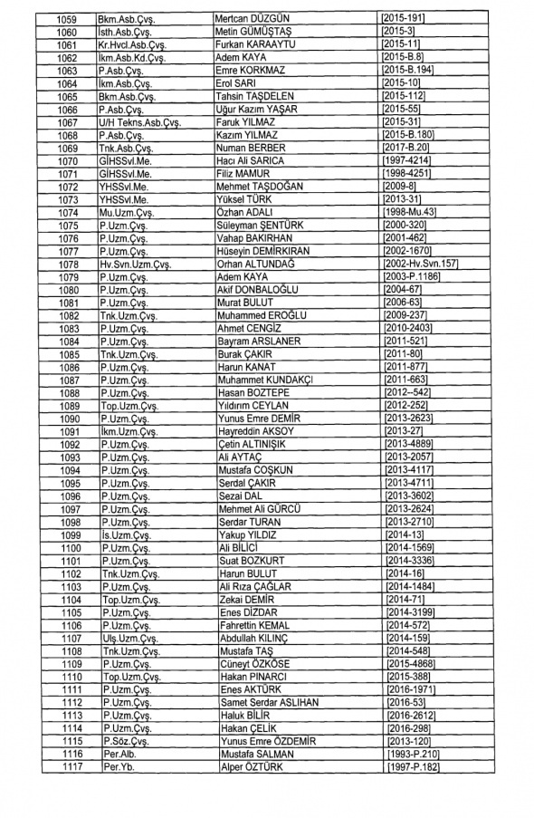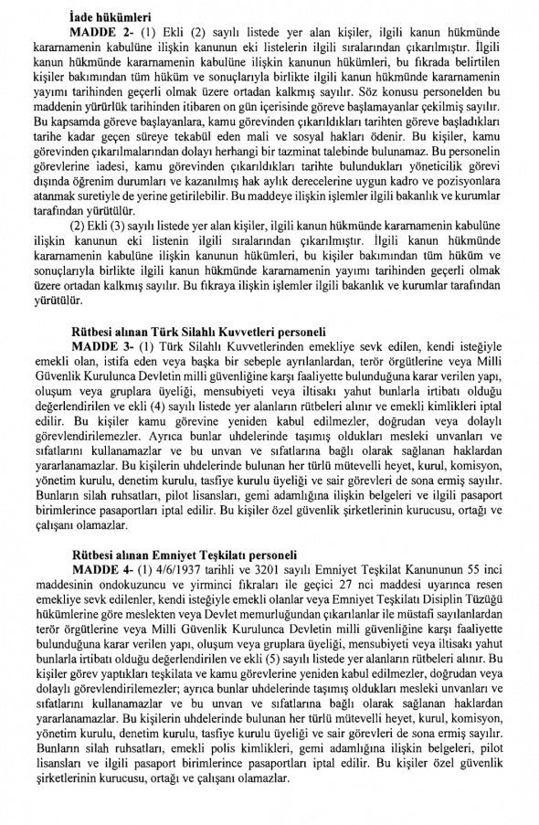 Kararnameye göre, Kara Kuvvetlerinde 240, Deniz Kuvvetlerinde 22, Hava Kuvvetlerinde 62 general, subay ve astsubayın rütbeleri ve emeklilik hakları ellerinden alınırken, İçişleri Bakanlığı Emniyet Genel Müdürlüğünden bin 167, Jandarma Genel Komutanlığından 35 emekli personelin rütbeleri alındı.