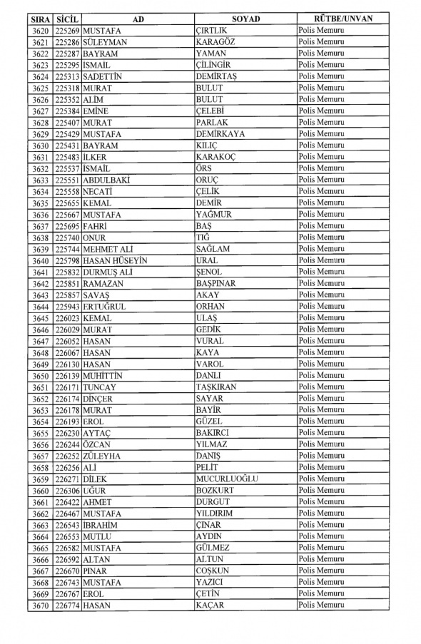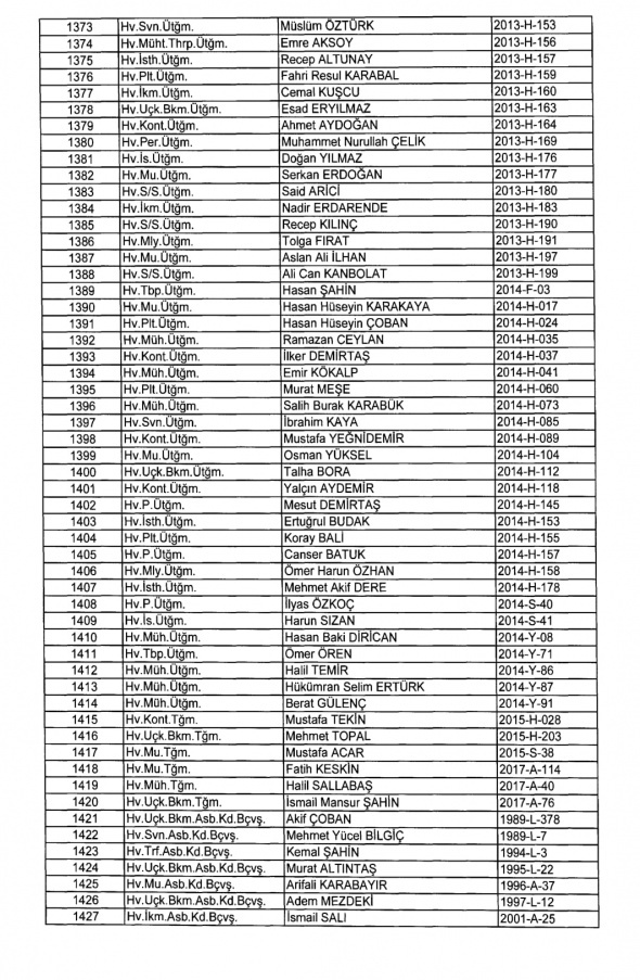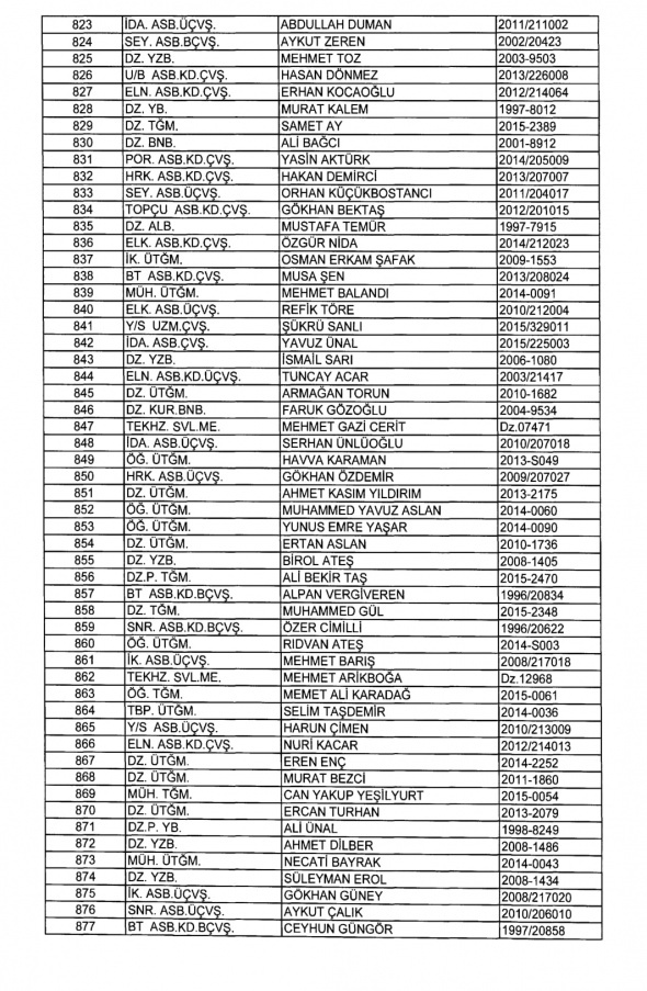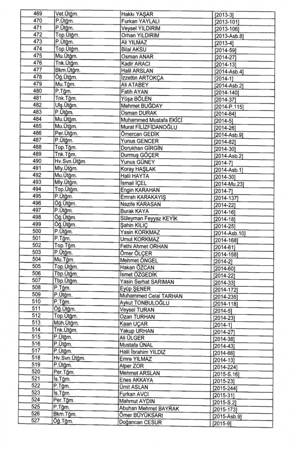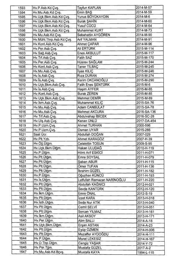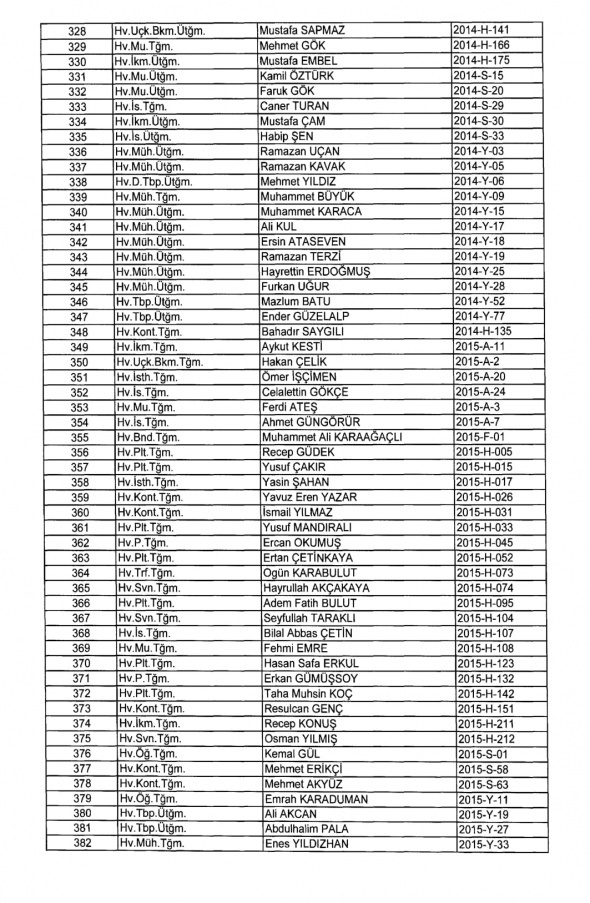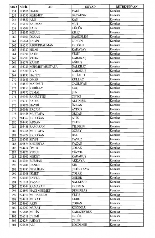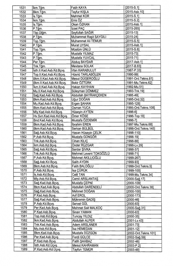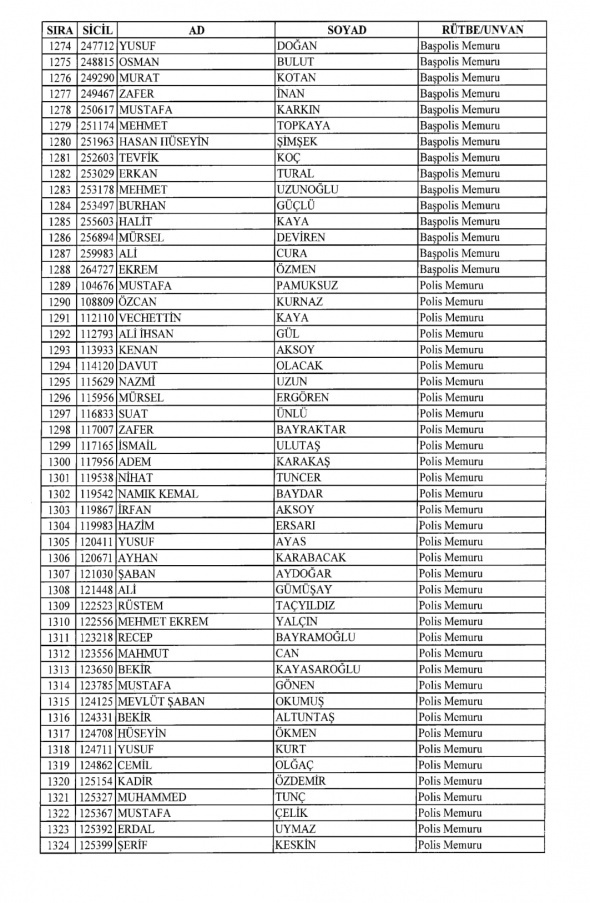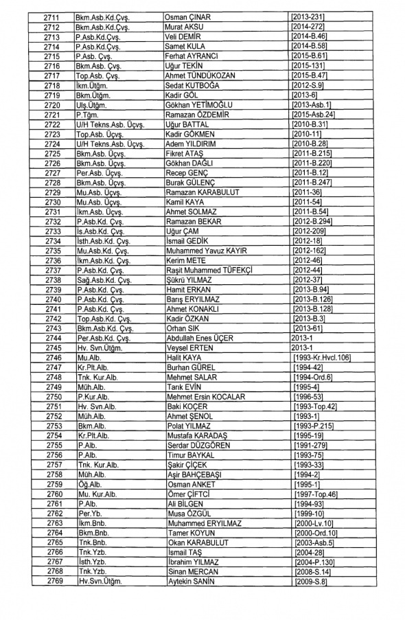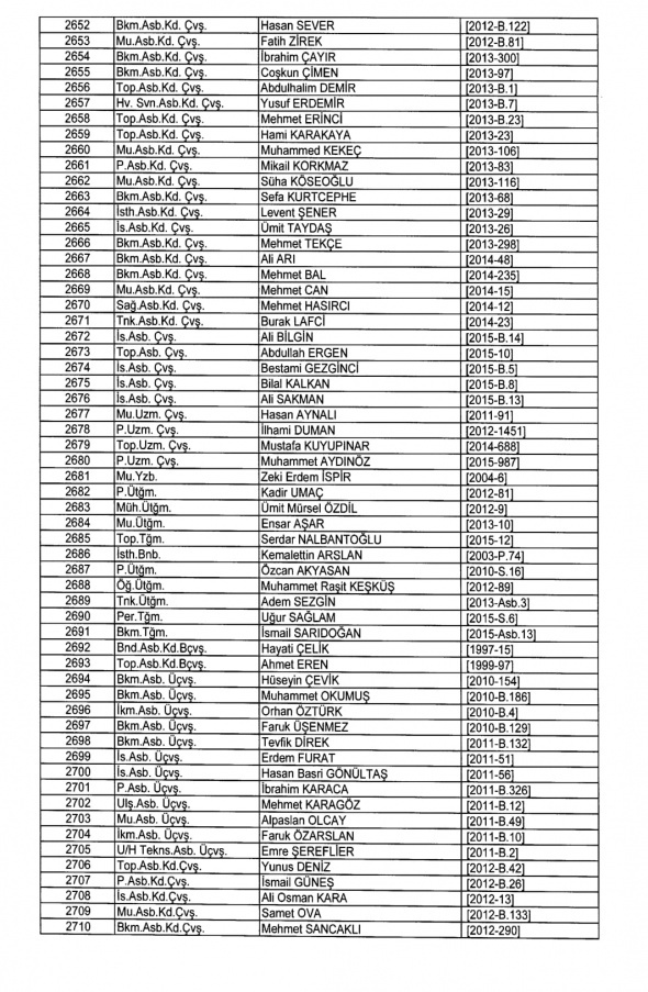 Kararnameye göre, Kara Kuvvetlerinde 240, Deniz Kuvvetlerinde 22, Hava Kuvvetlerinde 62 general, subay ve astsubayın rütbeleri ve emeklilik hakları ellerinden alınırken, İçişleri Bakanlığı Emniyet Genel Müdürlüğünden bin 167, Jandarma Genel Komutanlığından 35 emekli personelin rütbeleri alındı.
