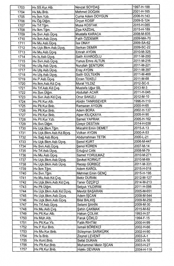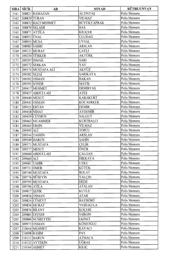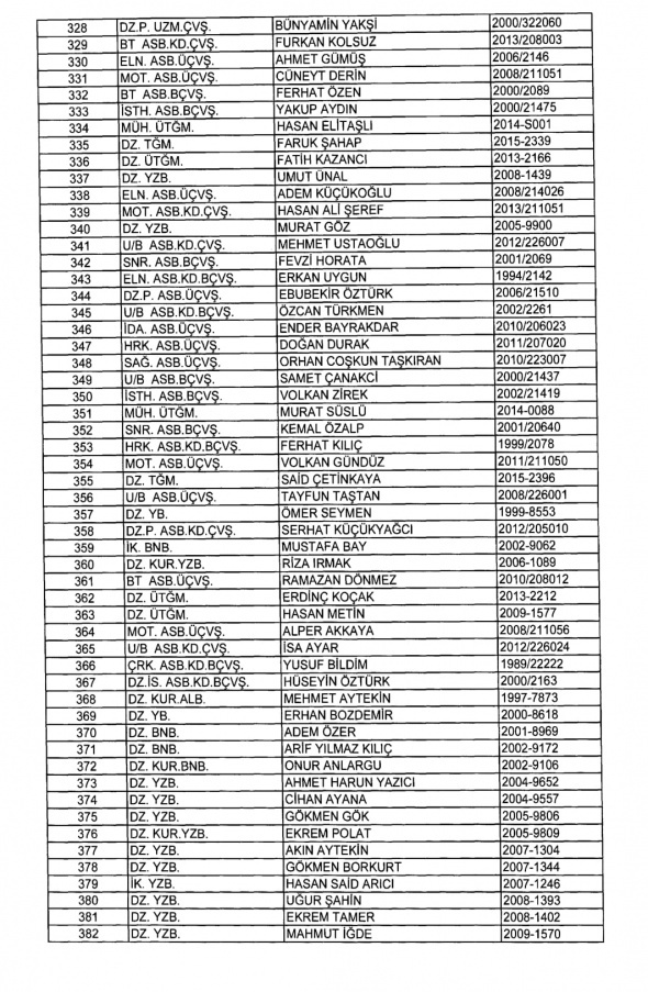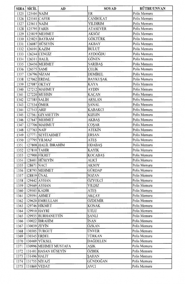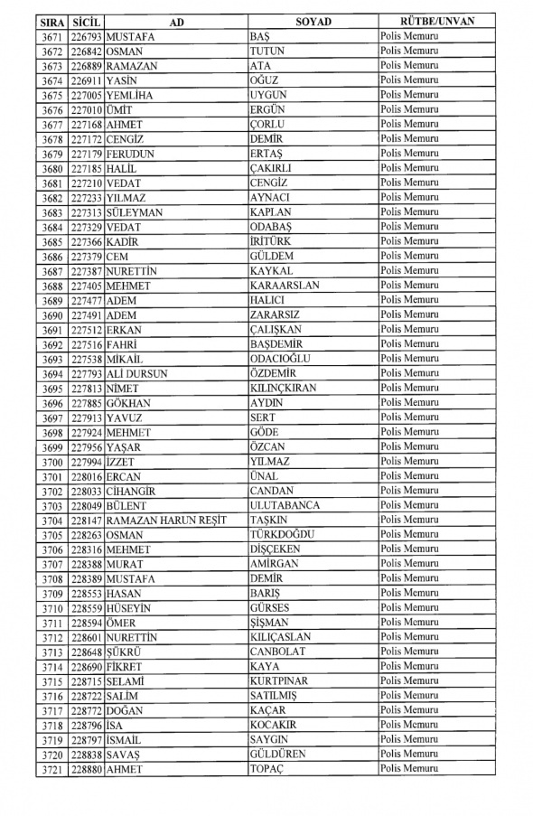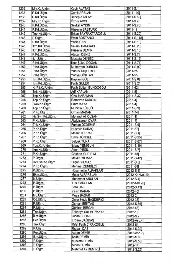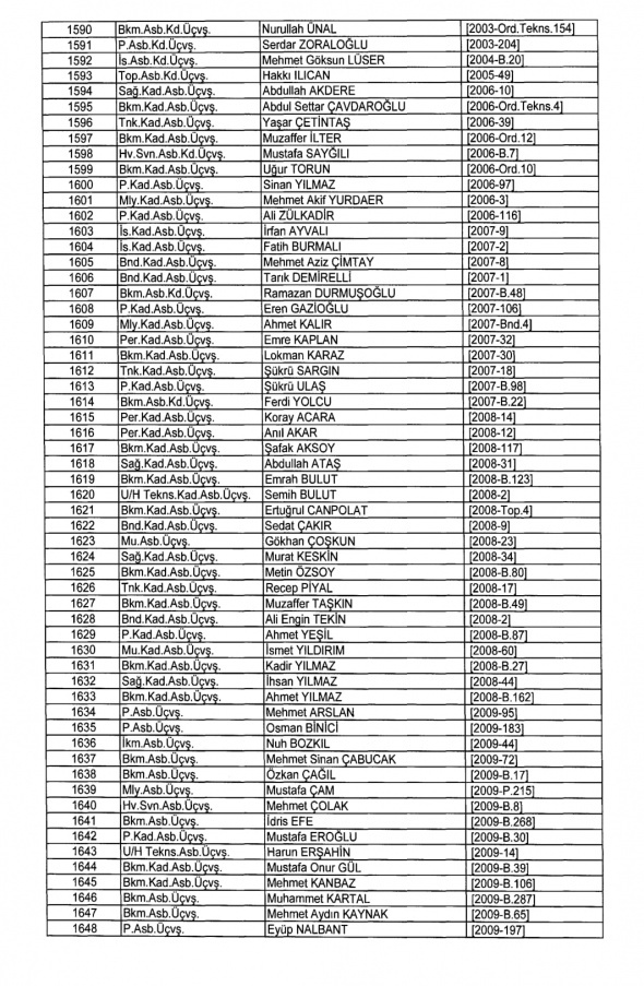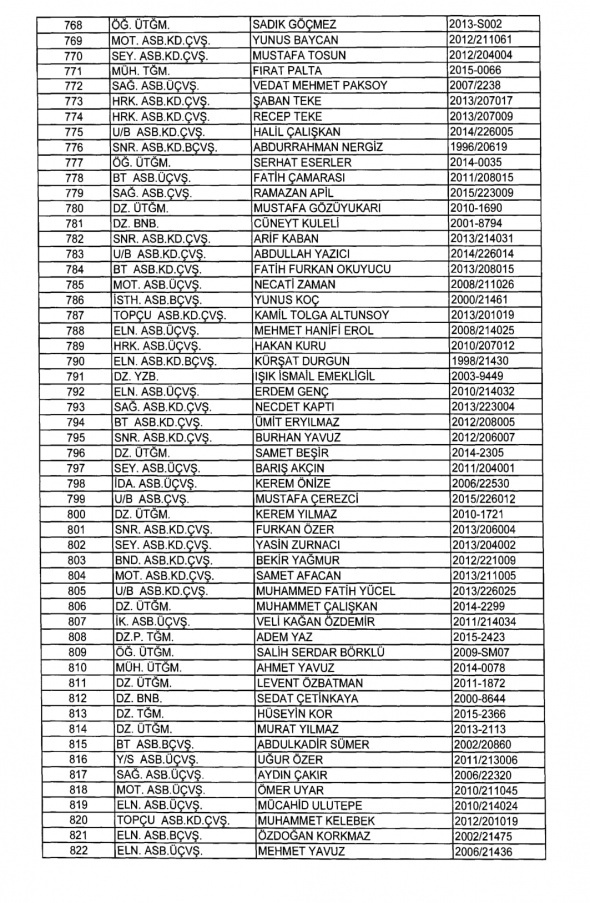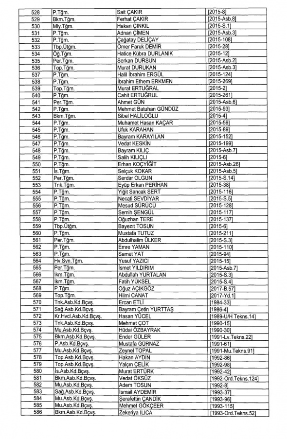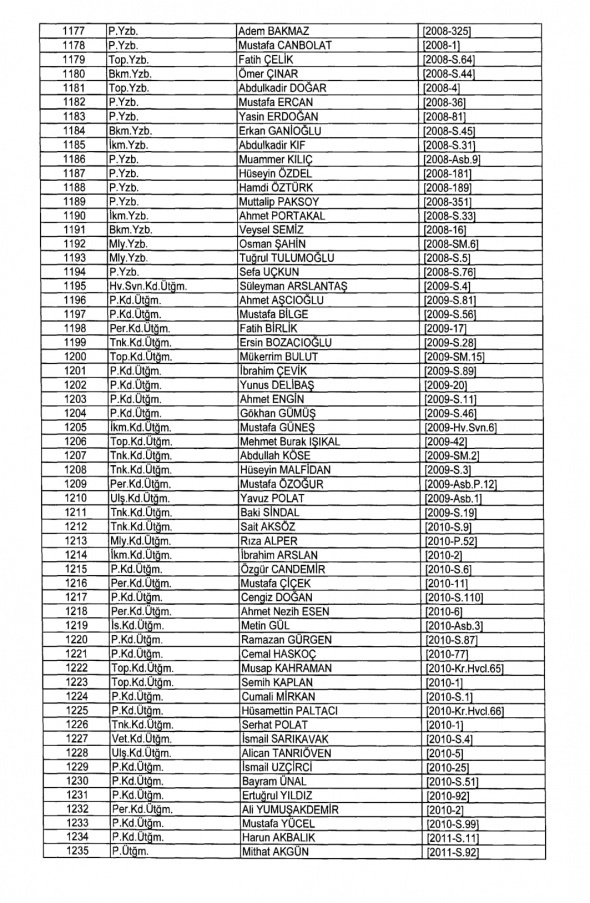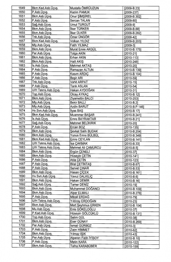 Kararnameye göre, Kara Kuvvetlerinde 240, Deniz Kuvvetlerinde 22, Hava Kuvvetlerinde 62 general, subay ve astsubayın rütbeleri ve emeklilik hakları ellerinden alınırken, İçişleri Bakanlığı Emniyet Genel Müdürlüğünden bin 167, Jandarma Genel Komutanlığından 35 emekli personelin rütbeleri alındı.
