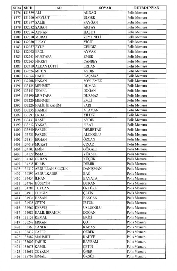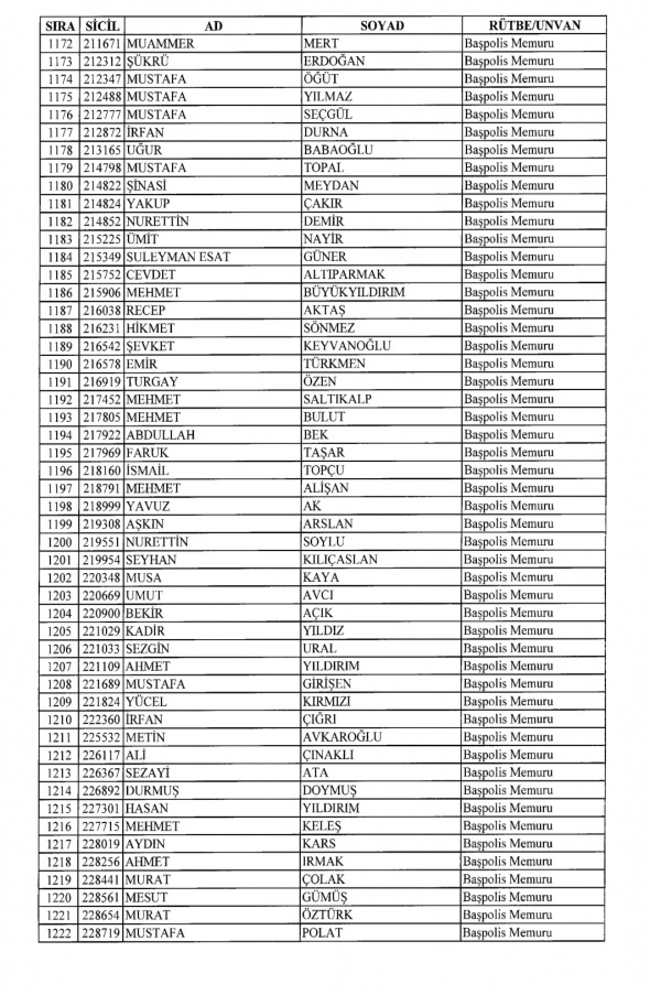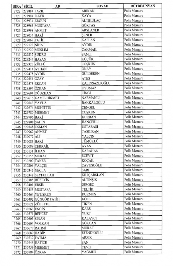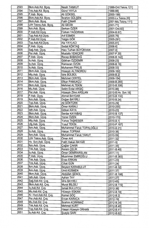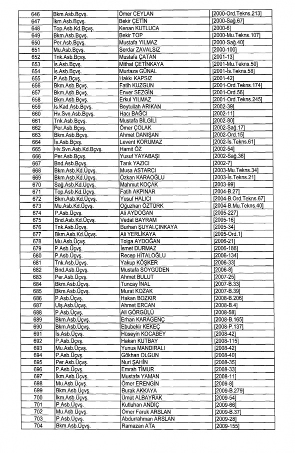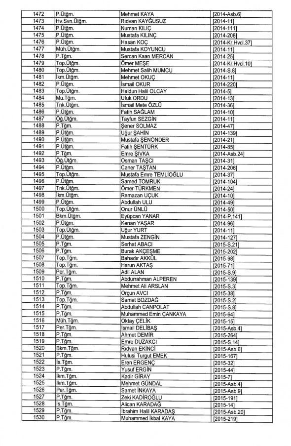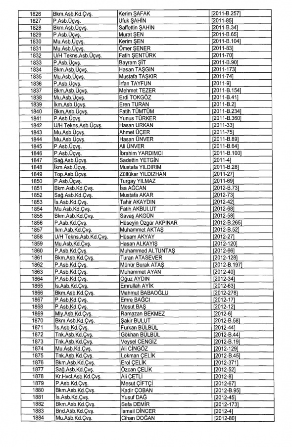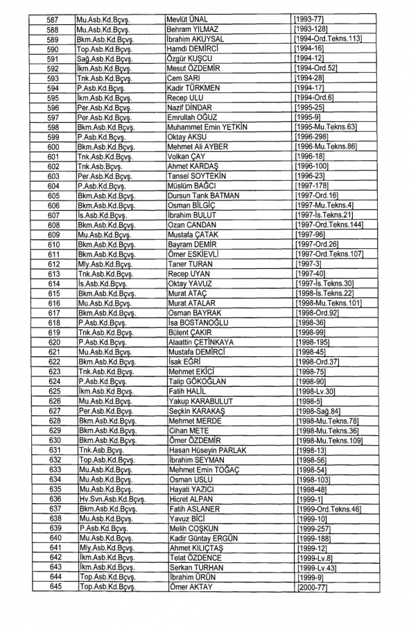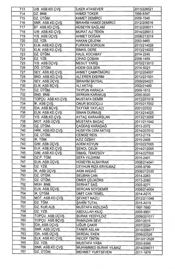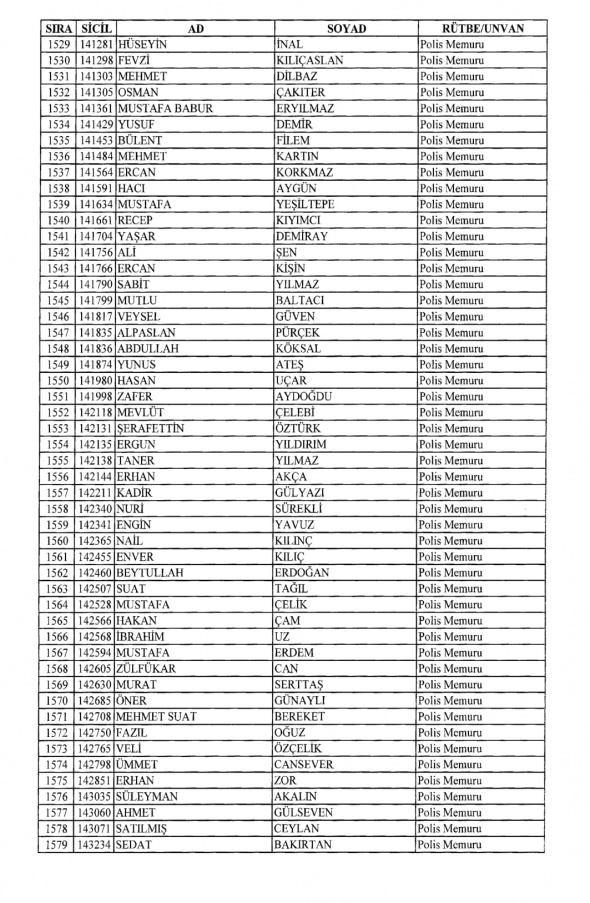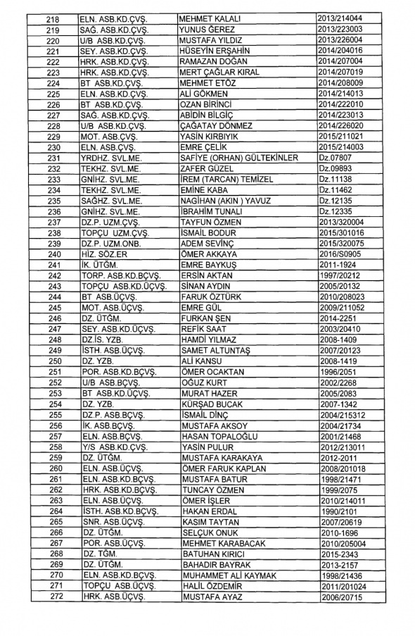 Kararnameye göre, Kara Kuvvetlerinde 240, Deniz Kuvvetlerinde 22, Hava Kuvvetlerinde 62 general, subay ve astsubayın rütbeleri ve emeklilik hakları ellerinden alınırken, İçişleri Bakanlığı Emniyet Genel Müdürlüğünden bin 167, Jandarma Genel Komutanlığından 35 emekli personelin rütbeleri alındı.