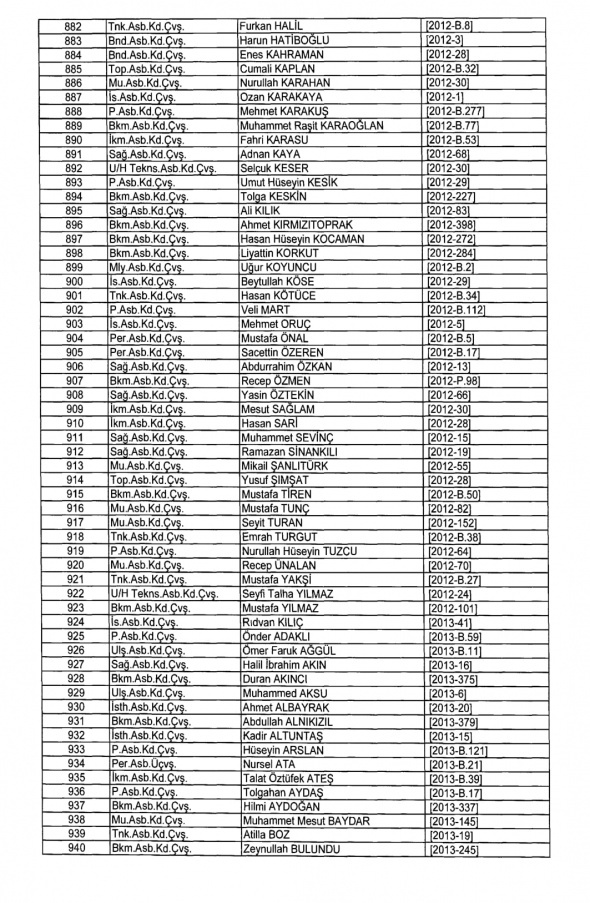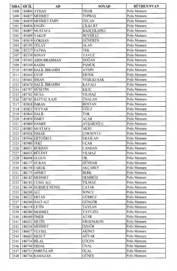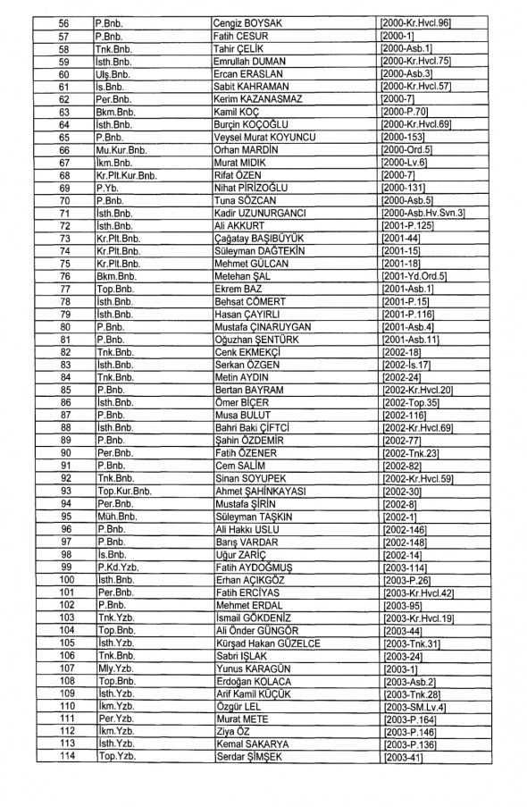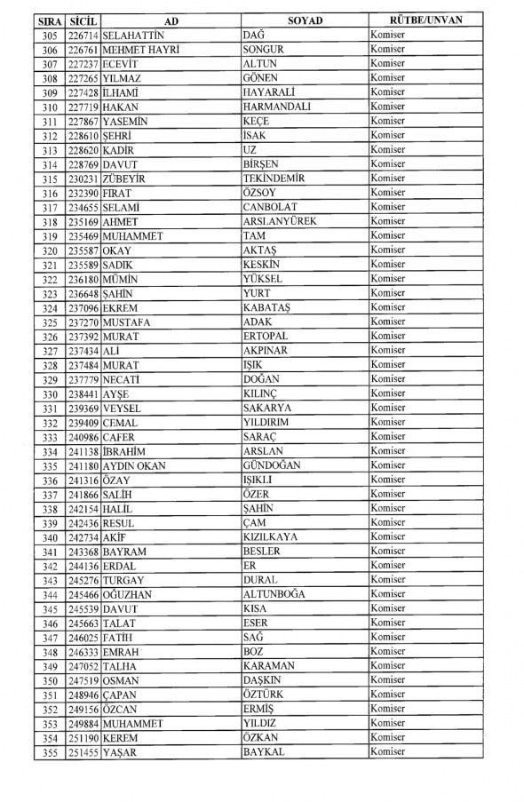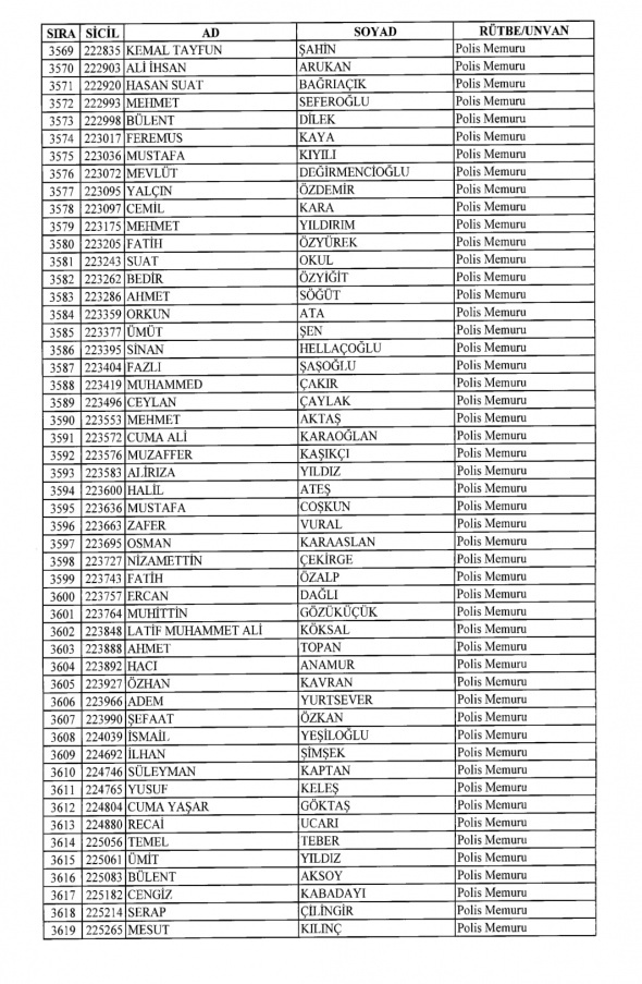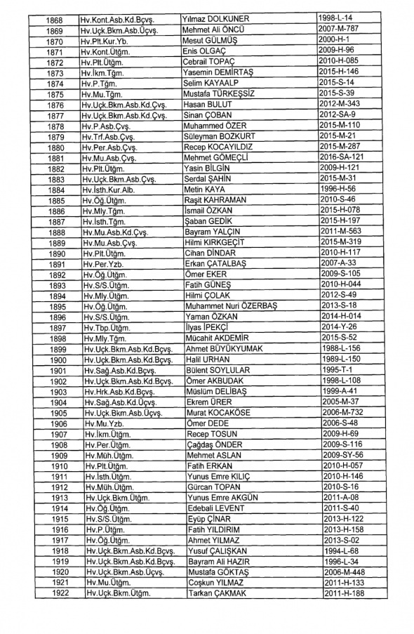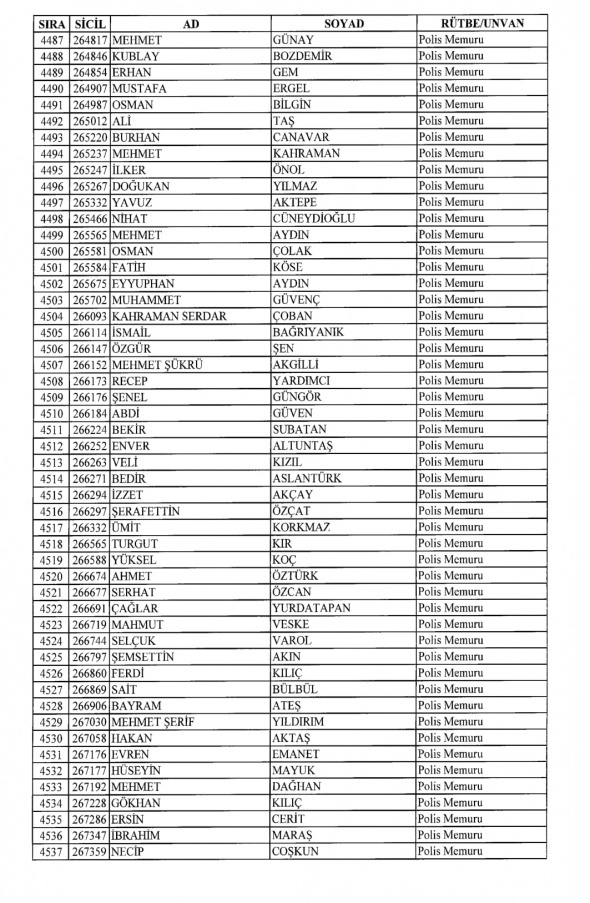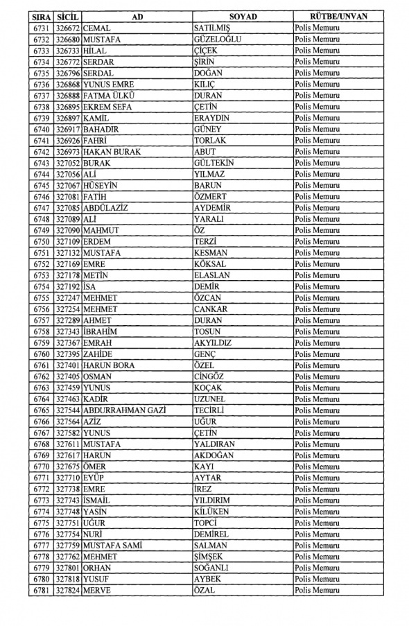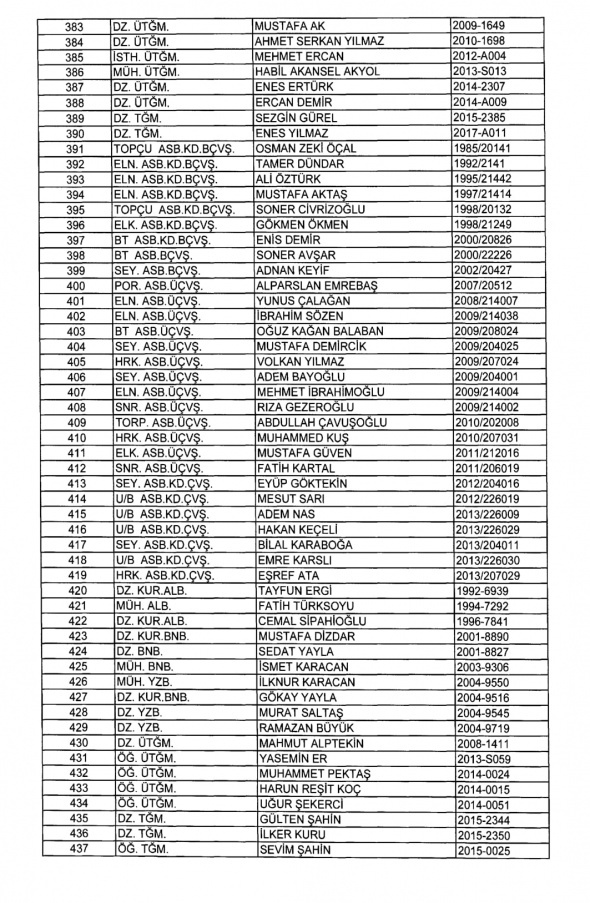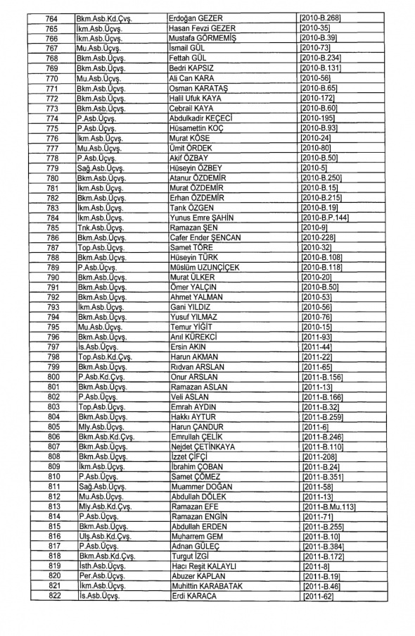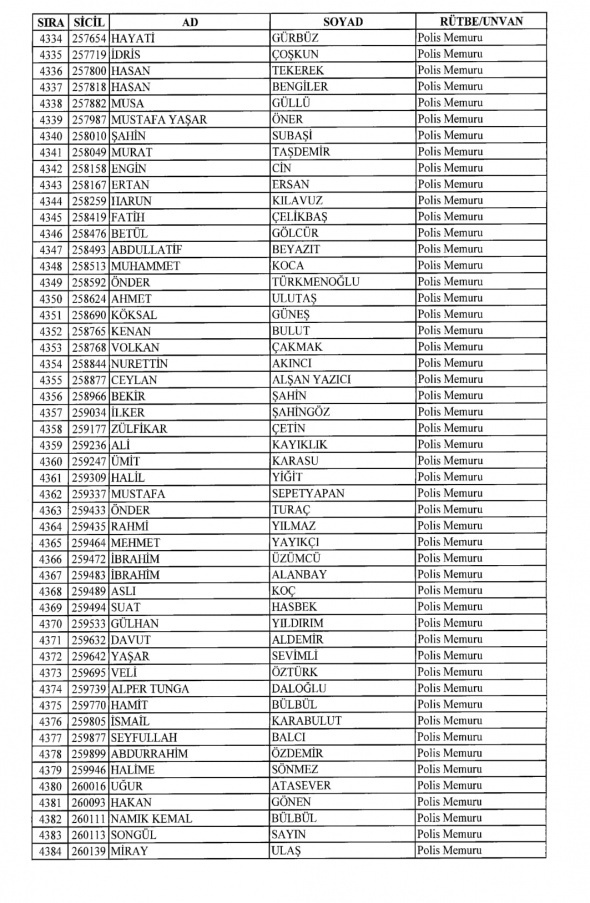 Kararnameye göre, Kara Kuvvetlerinde 240, Deniz Kuvvetlerinde 22, Hava Kuvvetlerinde 62 general, subay ve astsubayın rütbeleri ve emeklilik hakları ellerinden alınırken, İçişleri Bakanlığı Emniyet Genel Müdürlüğünden bin 167, Jandarma Genel Komutanlığından 35 emekli personelin rütbeleri alındı.