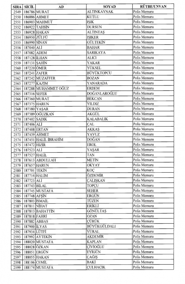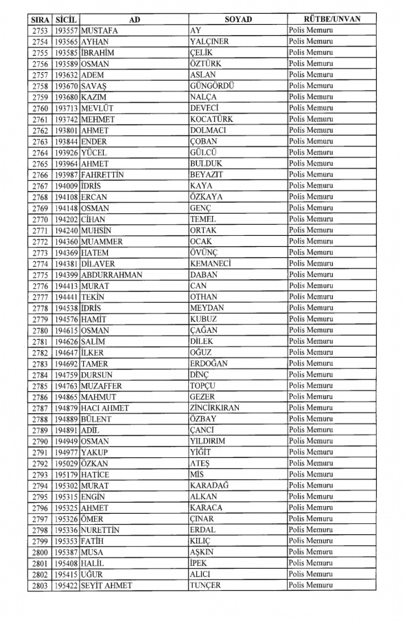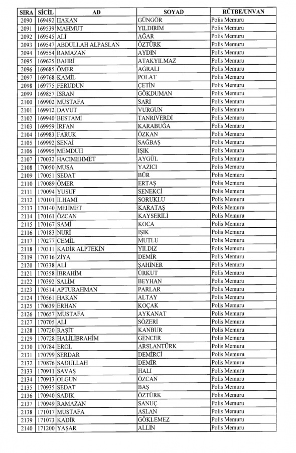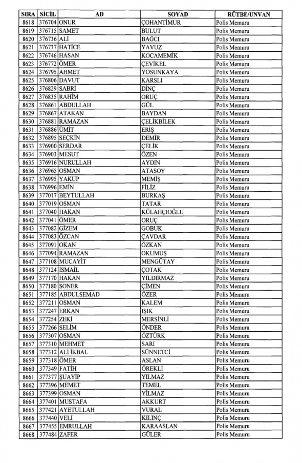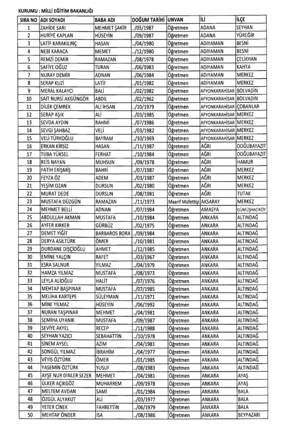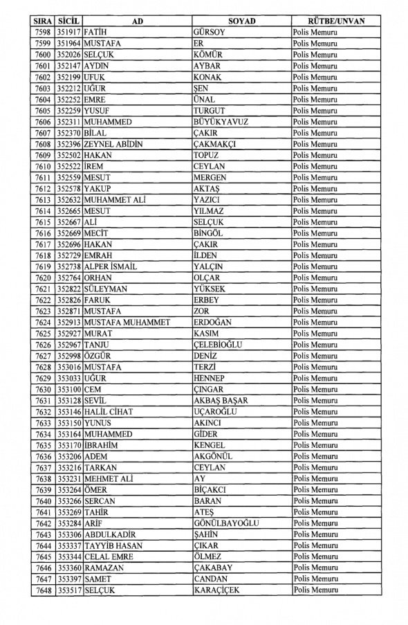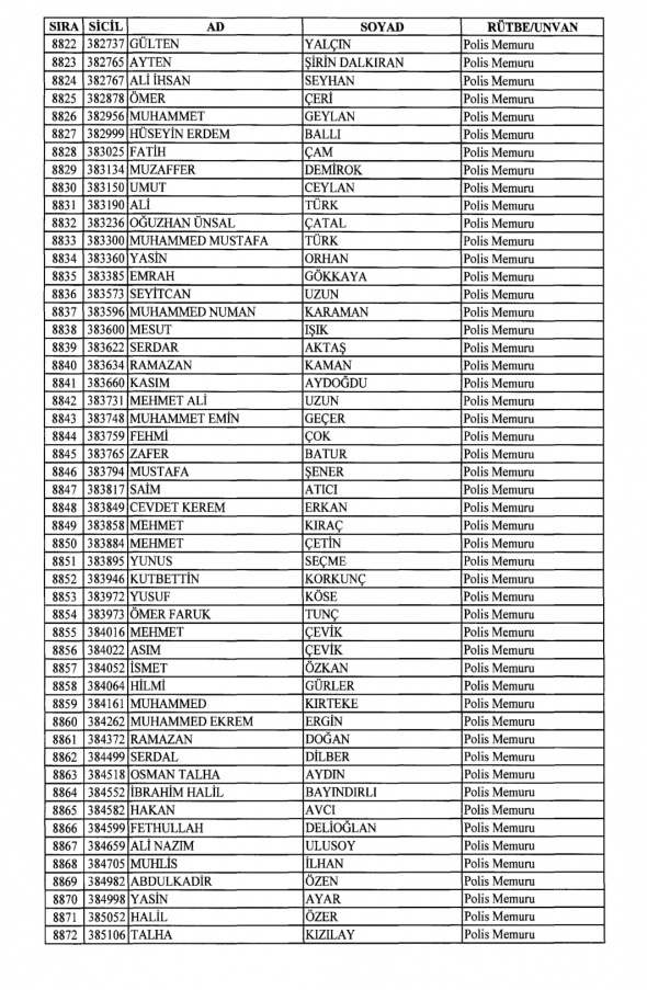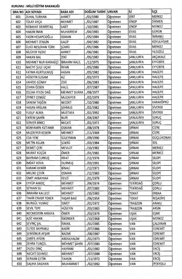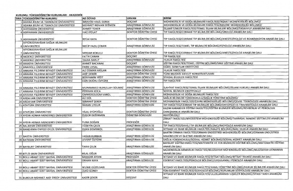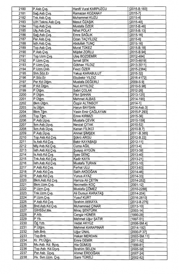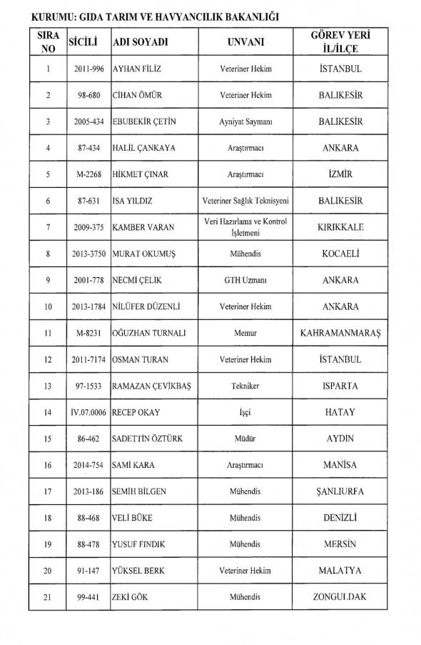 Bugünkü sayıda yayımlanan KHK’ya göre, Emniyet Genel Müdürlüğünden 8 bin 998 personel, Kara Kuvvetlerinden 3 bin 77, Deniz Kuvvetlerinden bin 126, Hava Kuvvetleri Komutanlığından bin 949, subay ve astsubay ihraç edildi. Adalet Bakanlığı ve bağlı bulunan kuruluşlardan aralarında hakim adayı ve infaz koruma memurlarının da bulunduğu bin 52 kişi, 4 vali yardımcısı ve 4 kaymakam, Jandarma Genel Komutanlığından 649 subay, astsubay ile uzman çavuş ihraç edildi. Milli Eğitim Bakanlığından 658, Dışişleri Bakanlığından 50, İçişleri Bakanlığından 31, Milli Savunma Bakanlığından 12 personel ihraç edildi. Yüksek Öğretim Kurumlarından 199'u akademik 52'si idari personel meslekten uzaklaştırıldı. Çeşitli kamu kurumlarında görev yapan toplam 18 bin 632 personel meslekten ihraç edildi.
