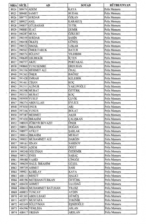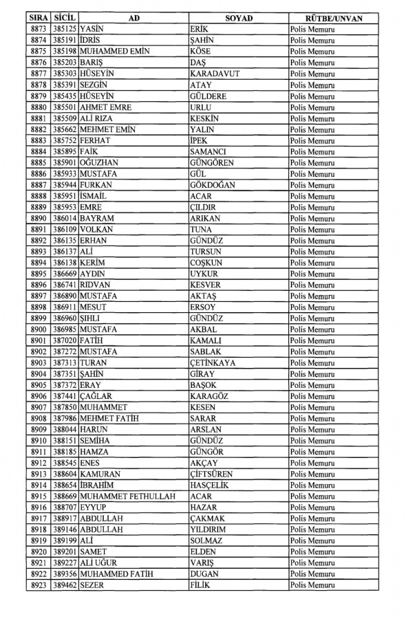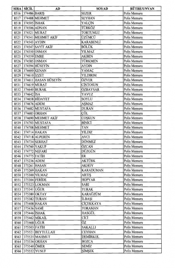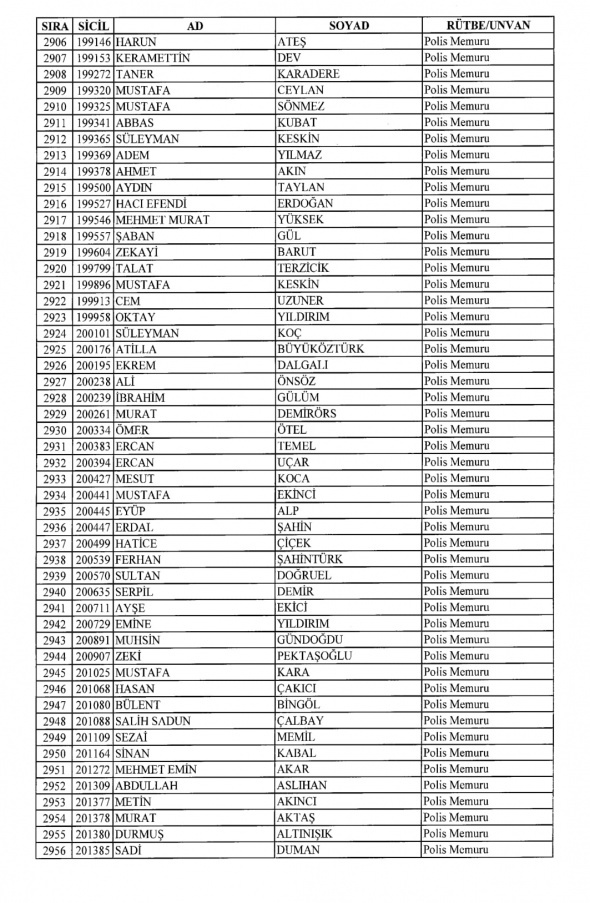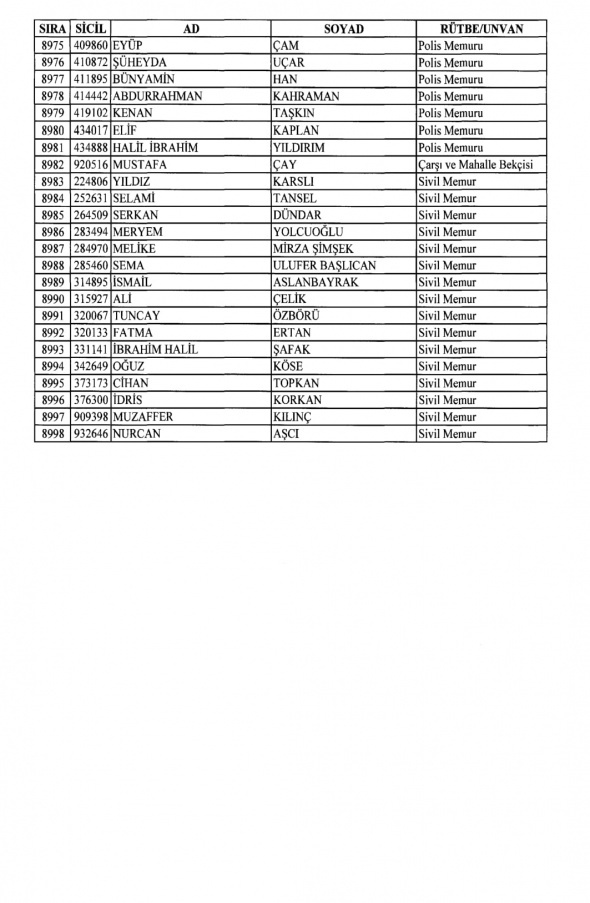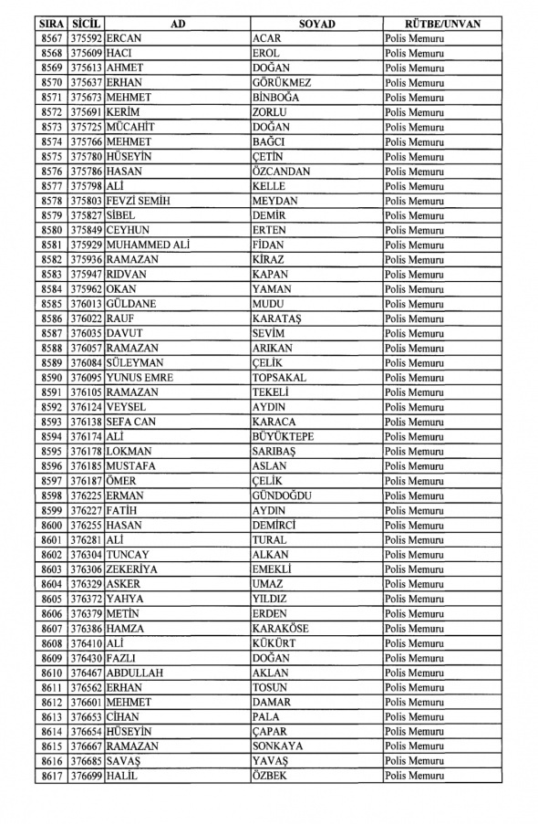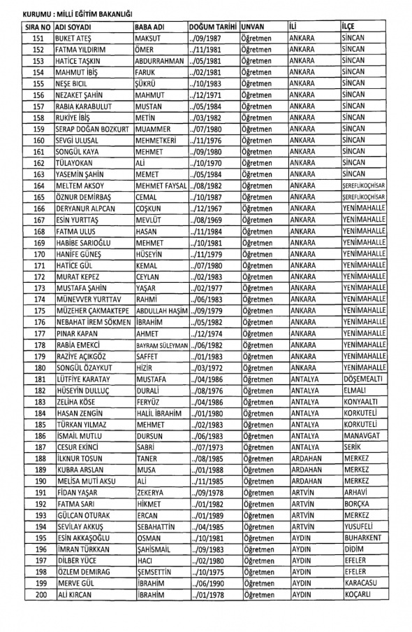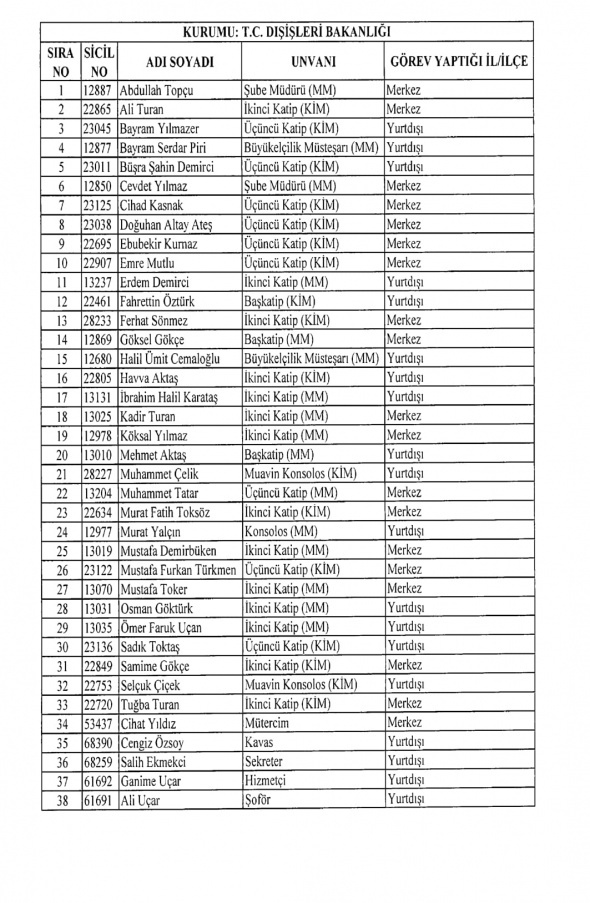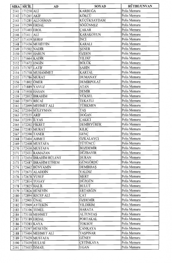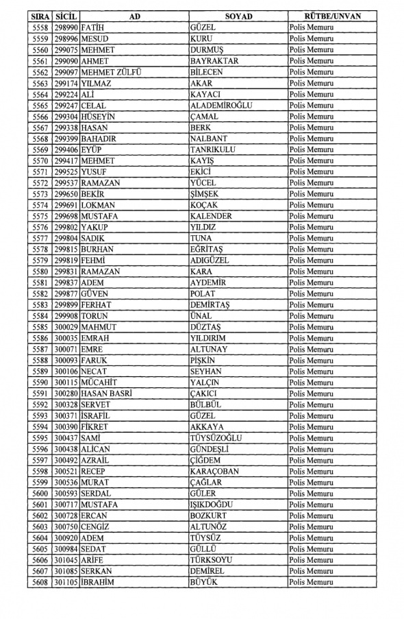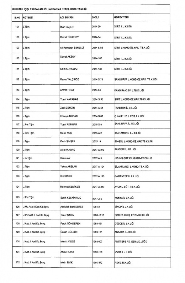 Bugünkü sayıda yayımlanan KHK’ya göre, Emniyet Genel Müdürlüğünden 8 bin 998 personel, Kara Kuvvetlerinden 3 bin 77, Deniz Kuvvetlerinden bin 126, Hava Kuvvetleri Komutanlığından bin 949, subay ve astsubay ihraç edildi. Adalet Bakanlığı ve bağlı bulunan kuruluşlardan aralarında hakim adayı ve infaz koruma memurlarının da bulunduğu bin 52 kişi, 4 vali yardımcısı ve 4 kaymakam, Jandarma Genel Komutanlığından 649 subay, astsubay ile uzman çavuş ihraç edildi. Milli Eğitim Bakanlığından 658, Dışişleri Bakanlığından 50, İçişleri Bakanlığından 31, Milli Savunma Bakanlığından 12 personel ihraç edildi. Yüksek Öğretim Kurumlarından 199'u akademik 52'si idari personel meslekten uzaklaştırıldı. Çeşitli kamu kurumlarında görev yapan toplam 18 bin 632 personel meslekten ihraç edildi.
