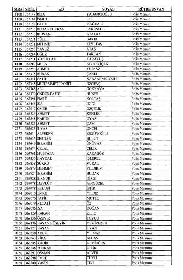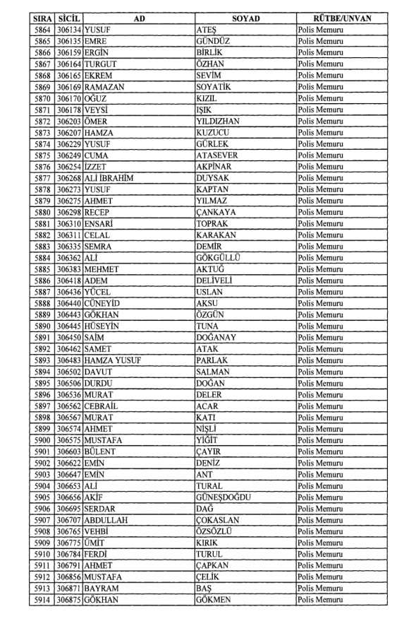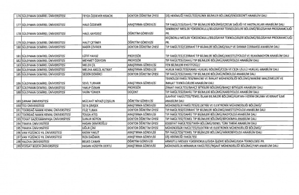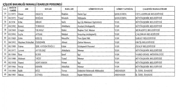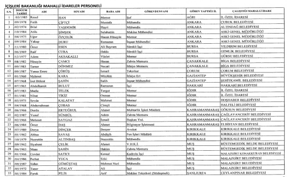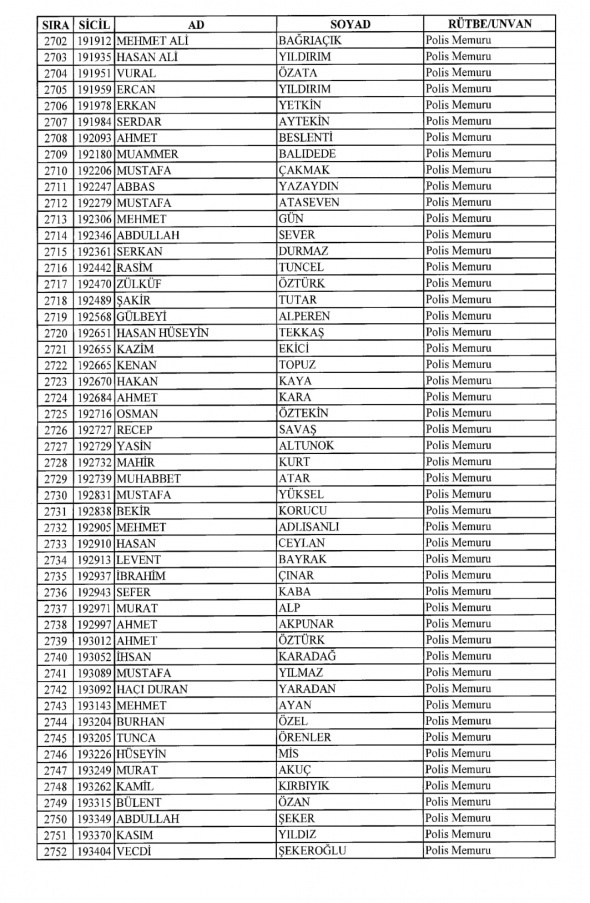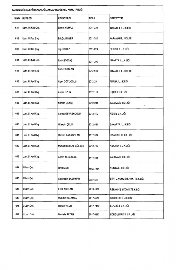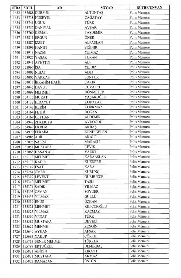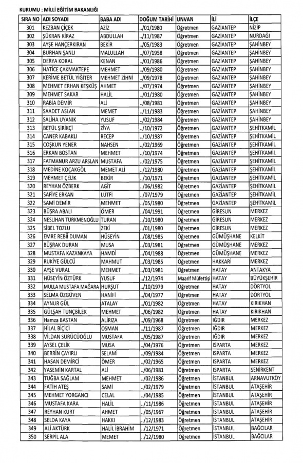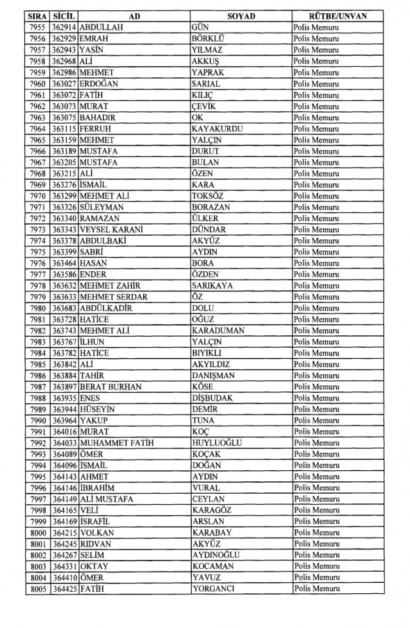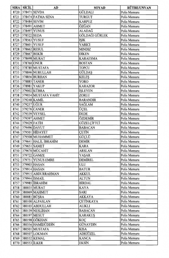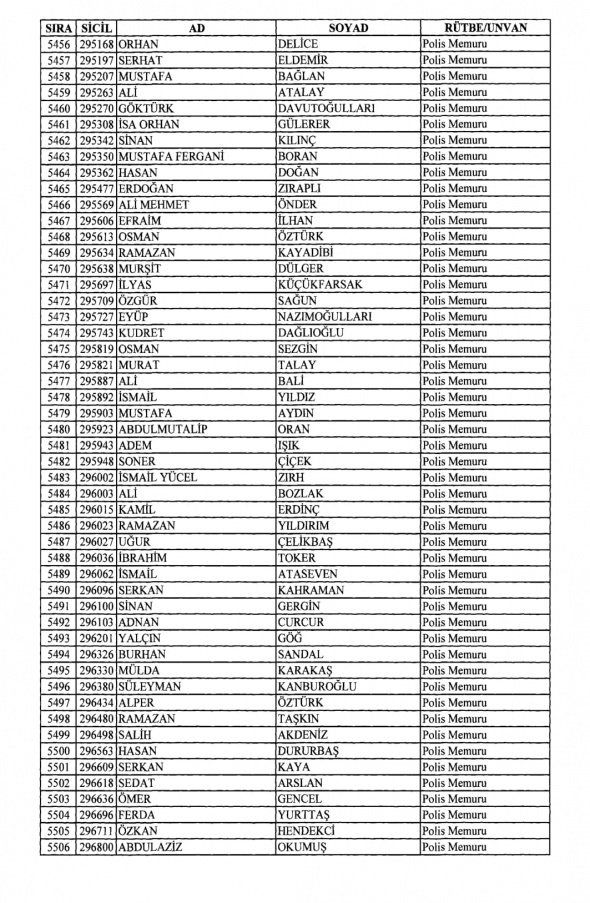 Bugünkü sayıda yayımlanan KHK’ya göre, Emniyet Genel Müdürlüğünden 8 bin 998 personel, Kara Kuvvetlerinden 3 bin 77, Deniz Kuvvetlerinden bin 126, Hava Kuvvetleri Komutanlığından bin 949, subay ve astsubay ihraç edildi. Adalet Bakanlığı ve bağlı bulunan kuruluşlardan aralarında hakim adayı ve infaz koruma memurlarının da bulunduğu bin 52 kişi, 4 vali yardımcısı ve 4 kaymakam, Jandarma Genel Komutanlığından 649 subay, astsubay ile uzman çavuş ihraç edildi. Milli Eğitim Bakanlığından 658, Dışişleri Bakanlığından 50, İçişleri Bakanlığından 31, Milli Savunma Bakanlığından 12 personel ihraç edildi. Yüksek Öğretim Kurumlarından 199'u akademik 52'si idari personel meslekten uzaklaştırıldı. Çeşitli kamu kurumlarında görev yapan toplam 18 bin 632 personel meslekten ihraç edildi.