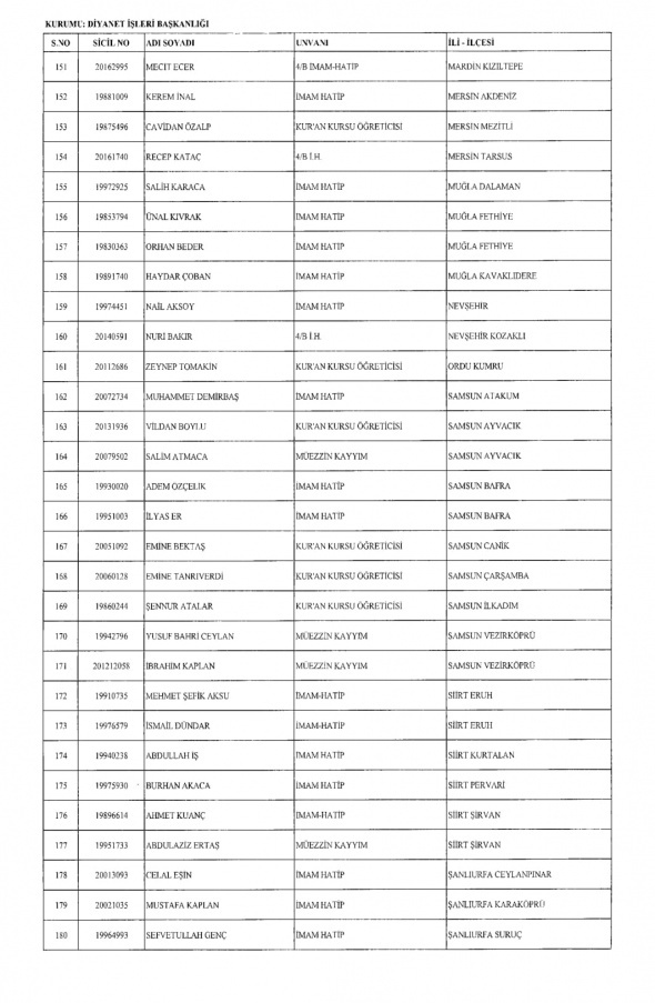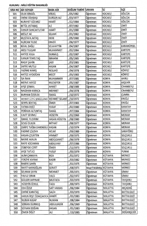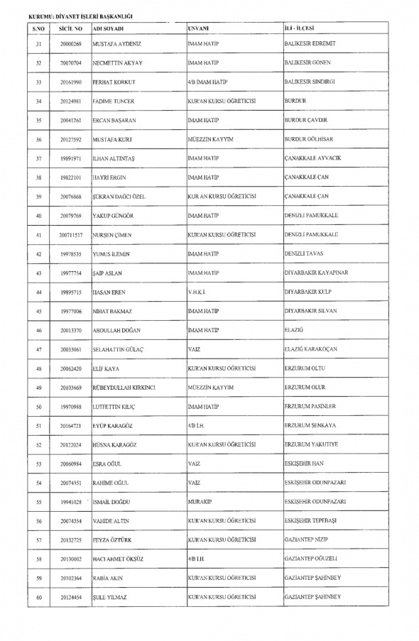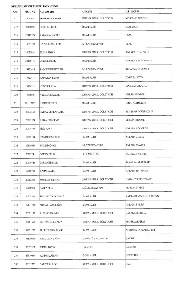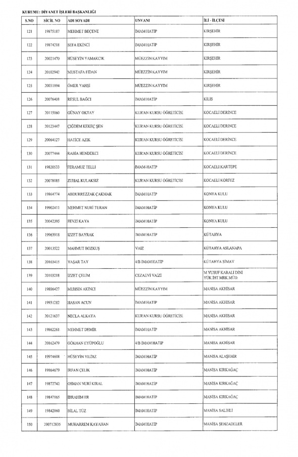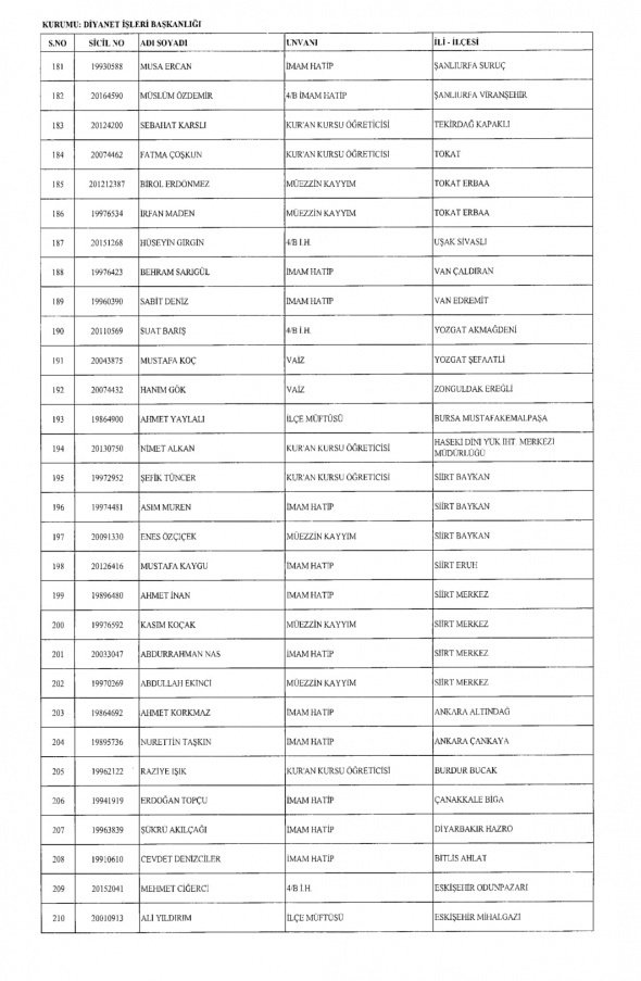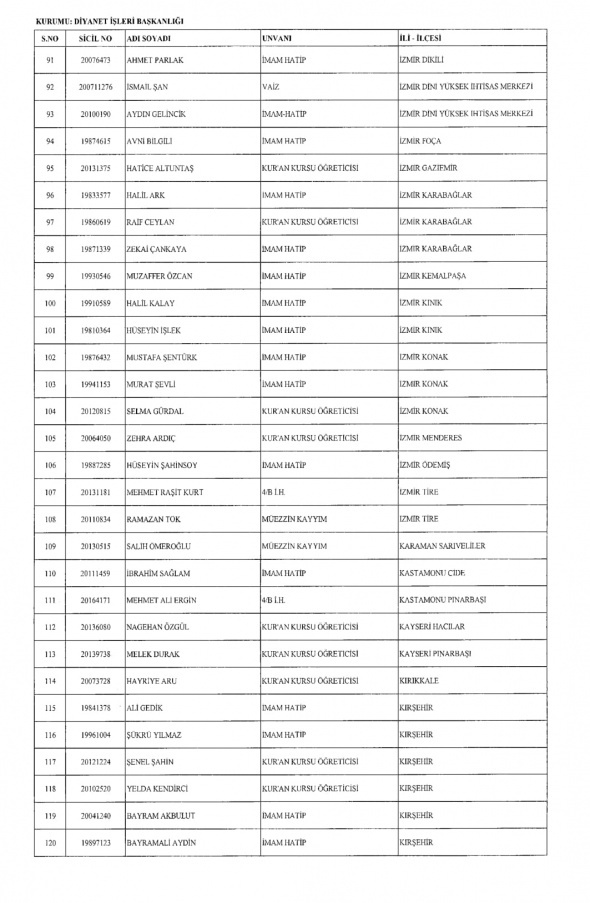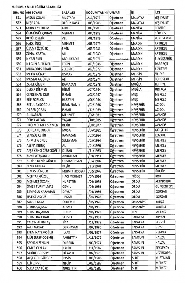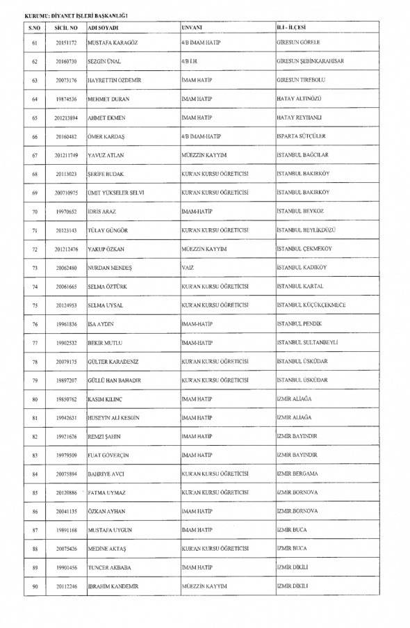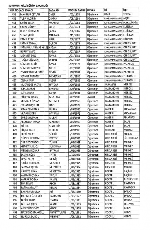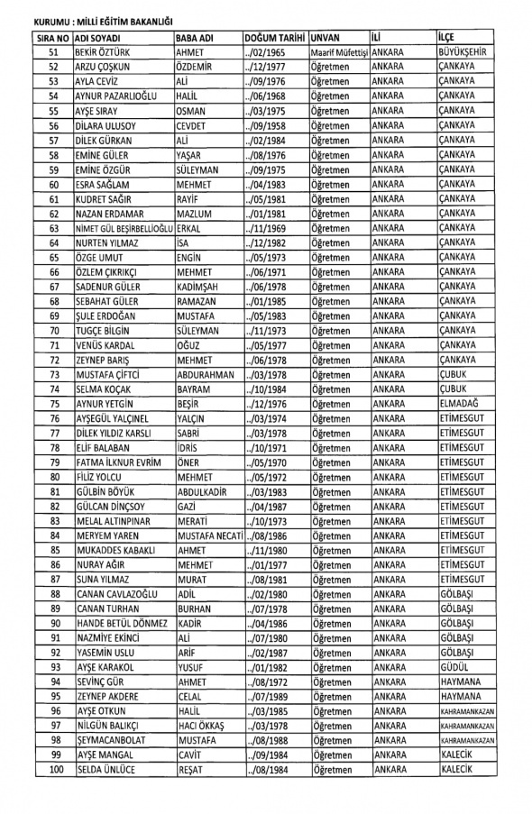 Yapılan soruşturmalar neticesinde daha önce ihraç edilen isimler arasında yer alan Diyanet İşleri Başkanlığından 30, Milli Eğitim Bakanlığından 1, Kara Kuvvetleri Komutanlığından 50, Hava Kuvvetleri Komutanlığından 26, Deniz Kuvvetleri Komutanlığından 5 ve yüksek eğitim kurumlarından 8 olmak üzere toplamda 129 kişinin görevlerine dönmelerinin önü açıldı.