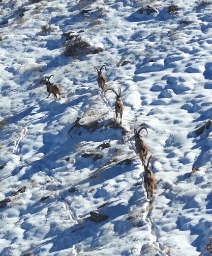 Kahramanmaraş’ta dağlık bölgelerde yaşayan yaban keçileri görüntülendi. Kahramanmaraş’ta Doğa Koruma ve Milli Parklar (DKMP) ekiplerinin yürüttüğü koruma ve denetim çalışmaları yaban hayatına olumlu yansımaya devam ediyor. İl genelinde gerçekleştirilen en son sayımda yaban keçisi popülasyonunun bin 100’e ulaştığı belirlendi. Yaban keçilerinin özellikle Elbistan’daki Şar Dağı başta olmak üzere Ekinözü, Nurhak, Afşin dağlarının yanı sıra Engizek Yaylası, Başkonuş mevkii, Berit ve Düldül dağları gibi yoğun olarak görüldüğü bildirildi. Sarp ve kayalık alanları yaşam alanı olarak tercih eden keçiler, bu bölgelerde yetişen doğal bitkilerle beslenerek yaşamlarını sürdürüyor. Keçilerin, bölgedeki zorlu şartlardaki yolculukları dron ile görüntülendi. Özel fiziki yapıları sayesinde engebeli ve kayalık arazilere kolaylıkla uyum sağlayabilen yaban keçileri, yoğun kar örtüsünün bulunduğu zorlu kış şartlarında dahi hayatta kalabiliyor.