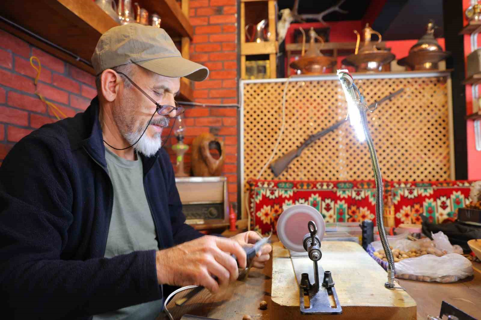 Kahramanmaraş’ta emekli vatandaş, almak istediği bir bilekliğin pahalı olmasıyla başladığı hobi serüvenini geliştirerek kendi yaptığı torna makinesiyle üretime başladı. Yaklaşık 10 yıldır el emeğiyle üretim yapan vatandaş, kurduğu amatör atölyede bileklikten tespihe, ahşap ürünlerden deri eşyaya kadar birçok ürün ortaya çıkarıyor. Kahramanmaraş’ta yaşayan emekli memur Mustafa Çot, hobisini zamanla geliştirerek kendi üretim araçlarını da yapmaya başladı. Fiyatlarının yüksek olması nedeniyle çözümü kendi imkanlarıyla üretmekte bulan Çot, küçük motorlar ve mandren kullanarak amatör bir torna sistemi kurdu. Mustafa Çot, bu sayede tespih başta olmak üzere birçok ürünü kendi atölyesinde üretmeye başladı. Pandemi döneminde evde geçirdiği zamanı fırsata çeviren Çot, üretim alanını genişleterek deri ve doğal taş ürünlere de yöneldi. Atık malzemeleri değerlendirerek oluşturduğu atölyesinde bileklik, tespih, kuksa, çerezlik ve deri cüzdan gibi birçok ürünü el emeğiyle hazırlayan Çot, zamanla çevresine de bu işleri öğretmeye başladı. Mustafa Çot, ürünleri kendisinin tasarlayıp yaptığını belirterek, "Bazı ürünleri dışarıda görüyoruz, hayranlıkla bakıyoruz ama ya pahalı buluyoruz ya da bulamıyoruz. Biz de farklı platformlardan takip ederek bunların yapımını öğrendik. Hem hobi oldu hem de stres atmamıza vesile oldu. Ortaya bir ürün çıkarmak gerçekten insana haz veriyor. Doğal taşlarla tanıştık. Bu taşları ham haliyle, işlemeden taka haline getirdik. Ahşaplardan kuksa yaptık, çerezlik yaptık. Evde kullanımı da çok hoş oluyor. Doğada vakit geçirmeyi seviyoruz. Dağlarda, ormanlarda yürüyüş yapıyoruz. Çantamızın kenarına bir kuksa koyuyoruz. Pınarlardan su içiyoruz, çayımızı, ayranımızı içiyoruz. Hem doğal hem sağlıklı olduğunu düşünüyoruz. Bir yürüyüşte andız ağacı ve meyvesiyle tanıştık. Daha önce andız tespihini duymuştuk ama nasıl yapıldığını bilmiyorduk. Onu da öğrendik" dedi. "El işiyle uğraşmak zihni dinlendiriyor" Bu işleri yapmaya yaklaşık 10 yıl önce başladığını belirten Çot, "Torna makinesi gerekiyordu ama fiyatlar yüksekti. Biz de küçük motorlar alarak, mandren bağlayarak kendi amatör tornamızı yaptık. Bir kaynakçı arkadaşımızdan destek aldık. O şekilde tespih yapmaya başladık. Zamanla geliştirdik. Pandemi döneminde evde kaldık. ’Ne yapabiliriz’ diye düşündük. Bu süreçte deriyle tanıştık. Deri nasıl kesilir, nasıl delinir öğrendik. Kendi cüzdanlarımızı, çantalarımızı yapabilecek duruma geldik. Sadece kendimize değil, çevremize de öğretmeye çalışıyoruz. Paracord bileklik yapıyoruz. Doğada çok işe yarıyor. Ayrıca makrome düğüm tekniğiyle evde salıncak bile yaptık. Herkes bir hobi edinmeli. Uzmanlar da söylüyor, el işiyle uğraşmak zihni dinlendiriyor. Gençler sadece telefon ve sosyal medyada vakit geçirmesin. Bir şeyler üretsinler. Bu işler hem terapi oluyor hem de isteyenler için gelir kapısı olabilir. İlaca gerek yok bu şeylerle uğraştığınız da kendinizi tedavi etmiş oluyorsunuz" dedi.