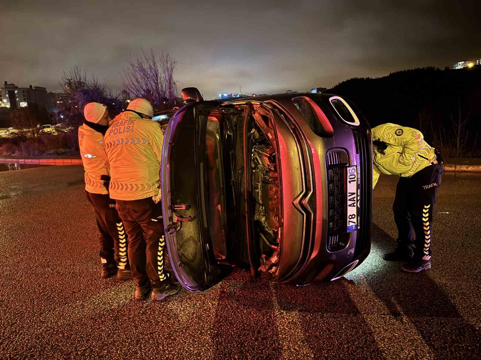 Karabük’te kontrolden çıkan hafif ticari aracın devrilmesi sonucu 1 kişi yaralandı. Kaza 100. Yıl Mahallesi 1010 Nolu Sokak’ta meydana geldi. Kimliği belirlenemeyen sürücü idaresindeki 78 AAV 106 plakalı hafif ticari araç Safranbolu istikametine seyir halindeyken kaldırıma çarpıp yaklaşık 50 metre ilerledikten sonra devrildi. Kazada araçta bulunan Ezgi Ç. yaralandı. İhbar üzerine olay yerine polis, itfaiye ve 112 Acil Servis ekipleri sevk edildi. Araçta sıkışan yaralı diğer sürücülerin yardımıyla çıkarılırken sağlık ekiplerinin ilk müdahalesinin ardından hastaneye kaldırıldı. Tedavi altına alınan yaralının sağlık durumunun iyi olduğu öğrenilirken, polis ekipleri sürücünün tespiti için çalışma başlattı.