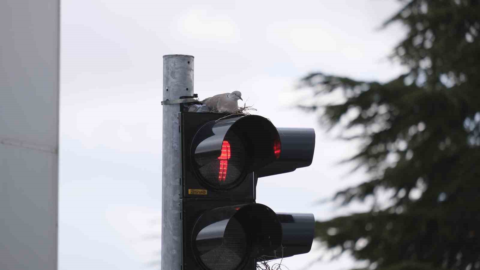 Karaman’ın en işlek kavşağındaki trafik lambasına yuva yapan kumru görenleri şaşırtıyor