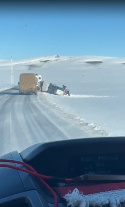 Arpaçay’da yoldan çıkan aracı köylüler el birliğiyle kurtardı