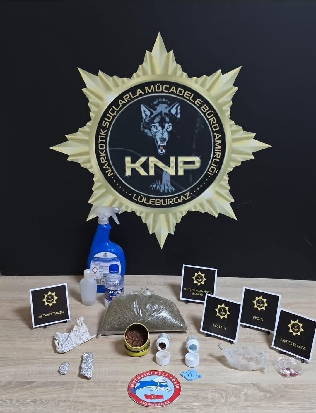 Kırklareli’nin Lüleburgaz ilçesinde polis ekiplerince düzenlenen uyuşturucu operasyonunda çok sayıda uyuşturucu madde ele geçirilirken, gözaltına alınan 1 şüpheli tutuklandı. Edinilen bilgiye göre, Lüleburgaz İlçe Emniyet Müdürlüğü Narkotik Suçlarla Mücadele Şubesi ekipleri ile Yunus timleri tarafından bir ikamete operasyon düzenlendi. Yapılan aramalarda 343,08 gram sentetik kannabinoid (bonzai), 22,59 gram eroin, 18,76 gram metamfetamin, 18 adet ekstasy hap, 6 adet sentetik ecza ile uyuşturucu madde üretiminde kullanılan kimyasal maddeler ele geçirildi. Operasyonda gözaltına alınan 1 şüpheli, emniyetteki işlemlerinin ardından adliyeye sevk edildi. Mahkemeye çıkarılan şüpheli tutuklanarak cezaevine gönderildi. Olayla ilgili soruşturma sürüyor.