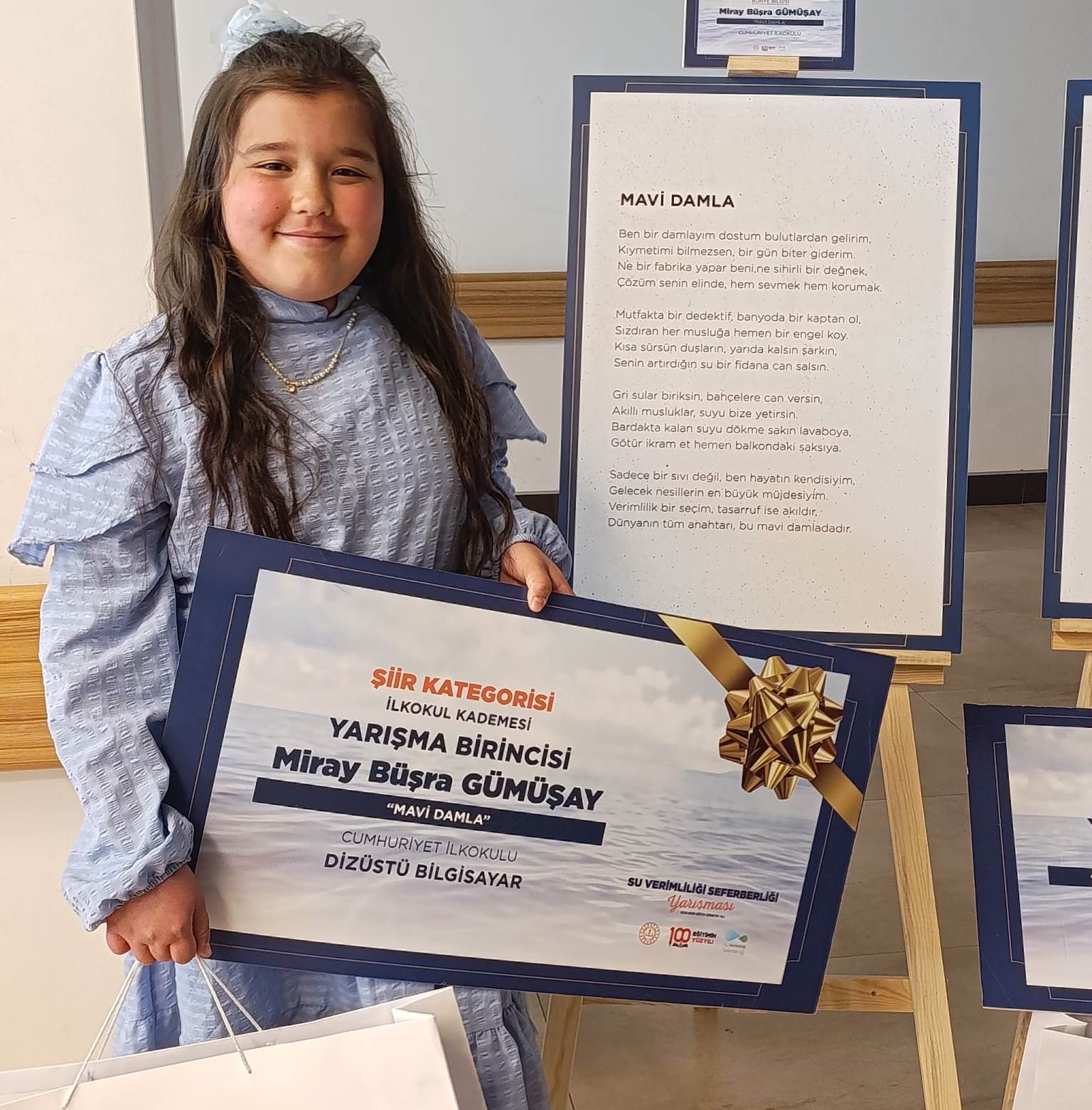 Tarım ve Orman Bakanlığı koordinasyonunda, Su Yönetimi Genel Müdürlüğü tarafından geleceğin "Su Gönüllüleri"ni yetiştirmek amacıyla düzenlenen "Su Verimliliği Seferberliği Yarışması"nda Kütahya’nın Hisarcık ilçesinden büyük bir başarı geldi. Yarışmanın şiir kategorisinde, Hisarcık Cumhuriyet İlkokulu 4-B sınıfı öğrencisi Miray Büşra Gümüşay Türkiye birincisi oldu. Türkiye genelinde resmi ve özel okullardaki ilkokul, ortaokul ve lise öğrencilerine yönelik olarak; resim, şiir, afiş, kompozisyon ve müzik dallarında düzenlenen yarışma, yoğun katılıma sahne oldu. Şiir kategorisinde zirveye çıkan Miray Büşra Gümüşay, elde ettiği dereceyle ilçesine gurur yaşattı. Ankara’da, Talim ve Terbiye Kurulu Başkanlığı salonunda gerçekleştirilen ödül törenine katılan başarılı öğrenciye dizüstü bilgisayar hediye edildi. Su kaynaklarının korunmasına dikkat çekmek amacıyla düzenlenen yarışma, öğrencilerde suyun sürdürülebilir kullanımı konusunda farkındalık oluşturmayı ve bu bilinci sanat yoluyla ifade etmelerini teşvik etmeyi amaçlıyor.