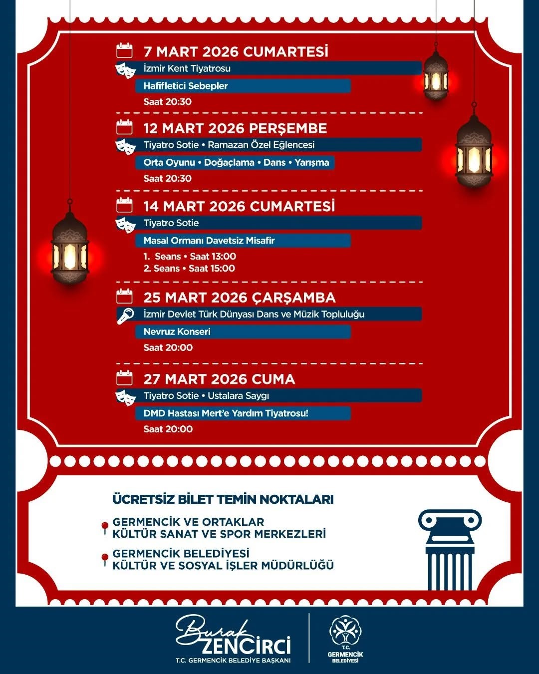 Germencik’te Mart ayı boyunca tiyatrodan konsere uzanan geniş kapsamlı kültür ve sanat etkinlikleri düzenlenecek. Germencik Belediyesi tarafından hazırlanan etkinlik programı kapsamında Germencik Belediyesi Konferans Salonu’nda birbirinden farklı gösteriler vatandaşlarla buluşacak. Program hakkında bilgi veren Burak Zencirci, Mart ayında kültür ve sanat dolu günlerin Germenciklileri beklediğini söyledi. Zencirci, tiyatrodan konsere, Ramazan özel eğlencesinden yardım gösterimine kadar dopdolu bir takvim hazırladıklarını belirterek, tüm vatandaşları etkinliklere davet etti. Program kapsamında 7 Mart Cumartesi günü İzmir Kent Tiyatrosu tarafından ’Hafifletici Sebepler’ adlı tiyatro oyunu sahnelenecek. 12 Mart’ta ise Tiyatro Soti tarafından Ramazan’a özel orta oyunu, doğaçlama ve dans gösterileri yapılacak. 14 Mart’ta çocuklara yönelik ’Masal Ormanı Davetsiz Misafir’ oyunu sahnelenirken, 25 Mart’ta İzmir Devlet Türk Dünyası Dans ve Müzik Topluluğu Nevruz Konseri ile sahne alacak. 27 Mart’ta ise yine Tiyatro Soti tarafından ’Ustalara Saygı’ yardım tiyatrosu düzenlenecek. Tüm etkinliklerin ücretsiz olacağını belirten Belediye Başkanı Zencirci, biletlerin Germencik ve Ortaklar Kültür Sanat ve Spor Merkezleri ile belediyenin Kültür ve Sosyal İşler Müdürlüğü’nden temin edilebileceğini ifade etti.