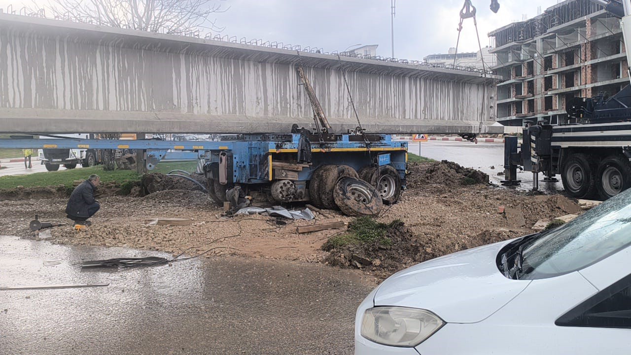 Siirt’te yapımı süren viyadük projesi için kente getirilen dev köprü kirişi, yüklendiği tır dönüş yaparken kavşakta takılı kaldı. Yol kapanırken, ekiplerin yolu açma çalışmaları devam ediyor. Olay, dün akşam Siirt-Bitlis kara yolu Mezopotamya Kavşağı’nda meydana geldi. Pervari ilçesinde yapımı süren viyadük inşaatı için bir tırla bölgeye nakledilen 50 metrelik beton köprü kirişi, tır kavşaktan dönüş yaparken yolda takılı kaldı. Kirişin yolu tamamen kapatması ile bölgede trafik akışı tamamen durdu. Trafik ekipleri, sürücüleri alternatif yollara yönlendirdi. İhbar üzerine bölgeye sevk edilen ekipler, vinç desteğiyle çalışma başlattı. Çalışmaların devam ettiği kaydedildi.