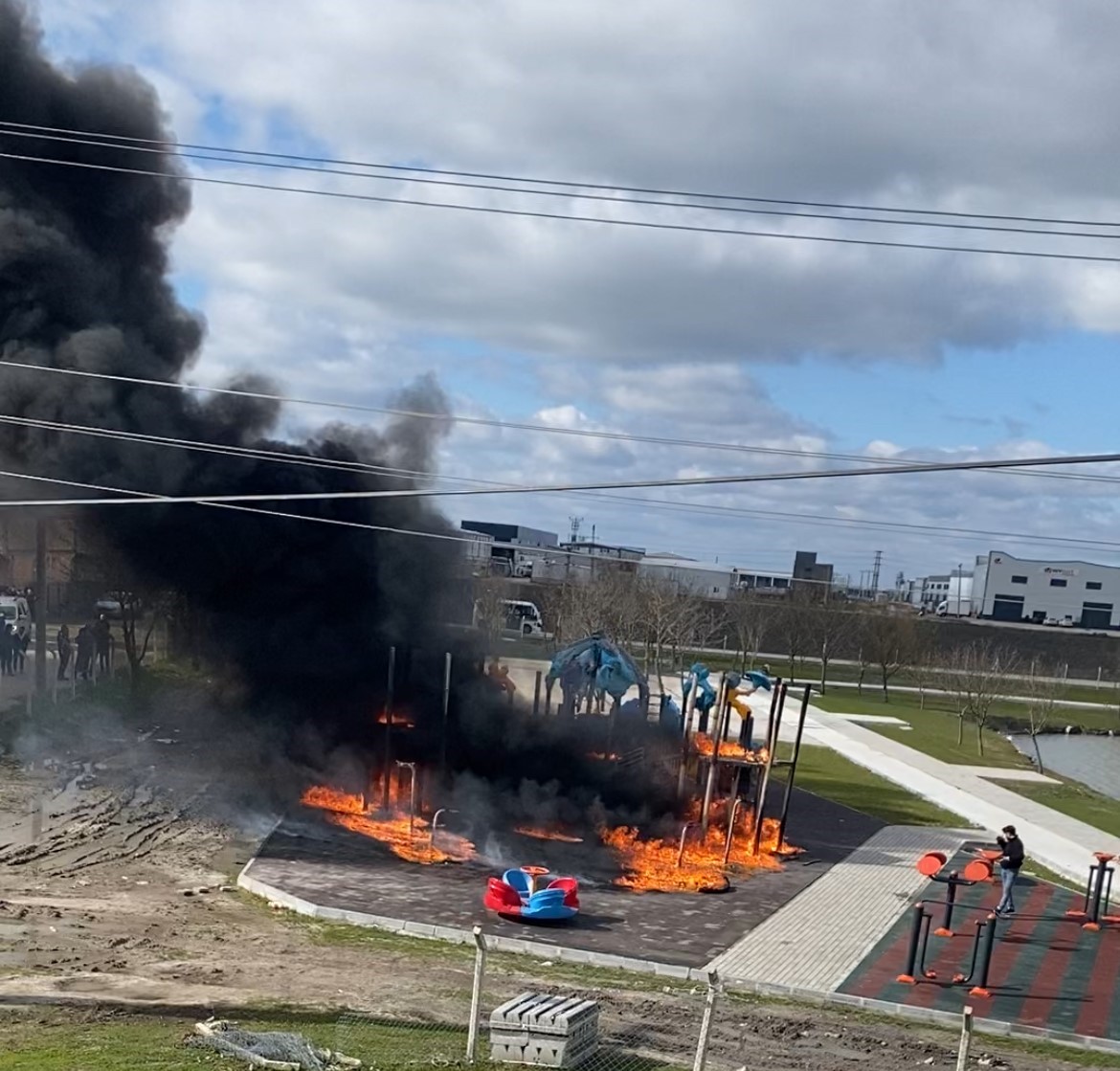 Tekirdağ’ın Ergene ilçesinde çocukların yaktığı ateş nedeniyle parktaki oyun grupları alev alev yandı. Marmaracık Mahallesi’nde 9. Cadde üzerinde bulunan Gölet yanındaki yeni yapılan parkta iddiaya göre, küçük yaştaki çocuklar ateş yaktı. Çıkan yangının büyümesi üzerine oyun grupları alev alev yandı. İhbar üzerine olay yerine gelen itfaiye ekipleri yangına müdahale ederek söndürdü. Çıkan yangın sonucu parkta büyük çaplı hasar meydana geldi. Polis tarafından olayla ilgili inceleme başlatıldı.