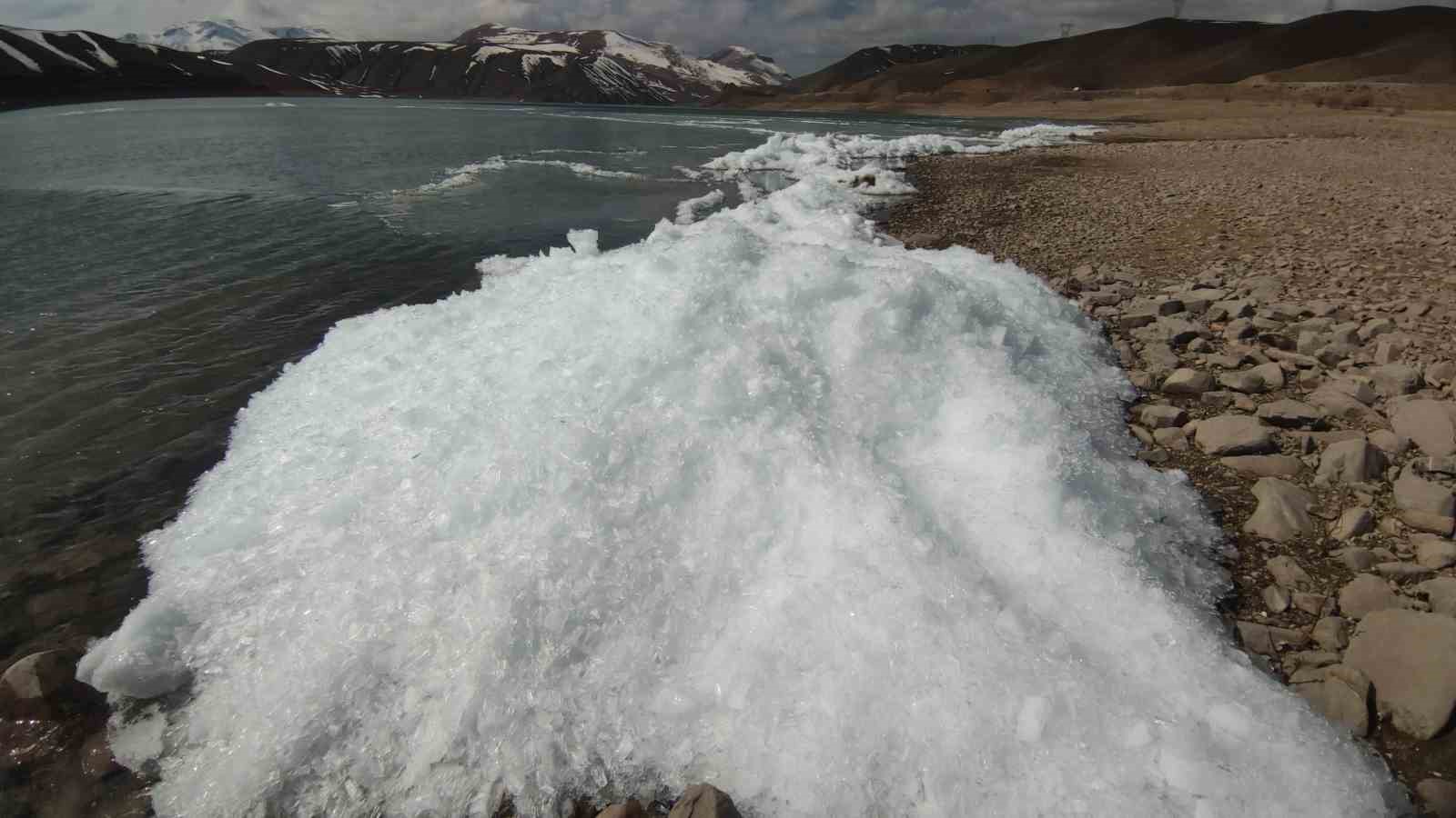 Van’da baraj gölünde donan dalgalar görsel şölen sundu